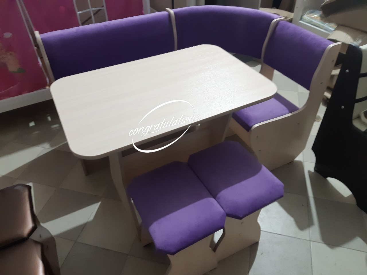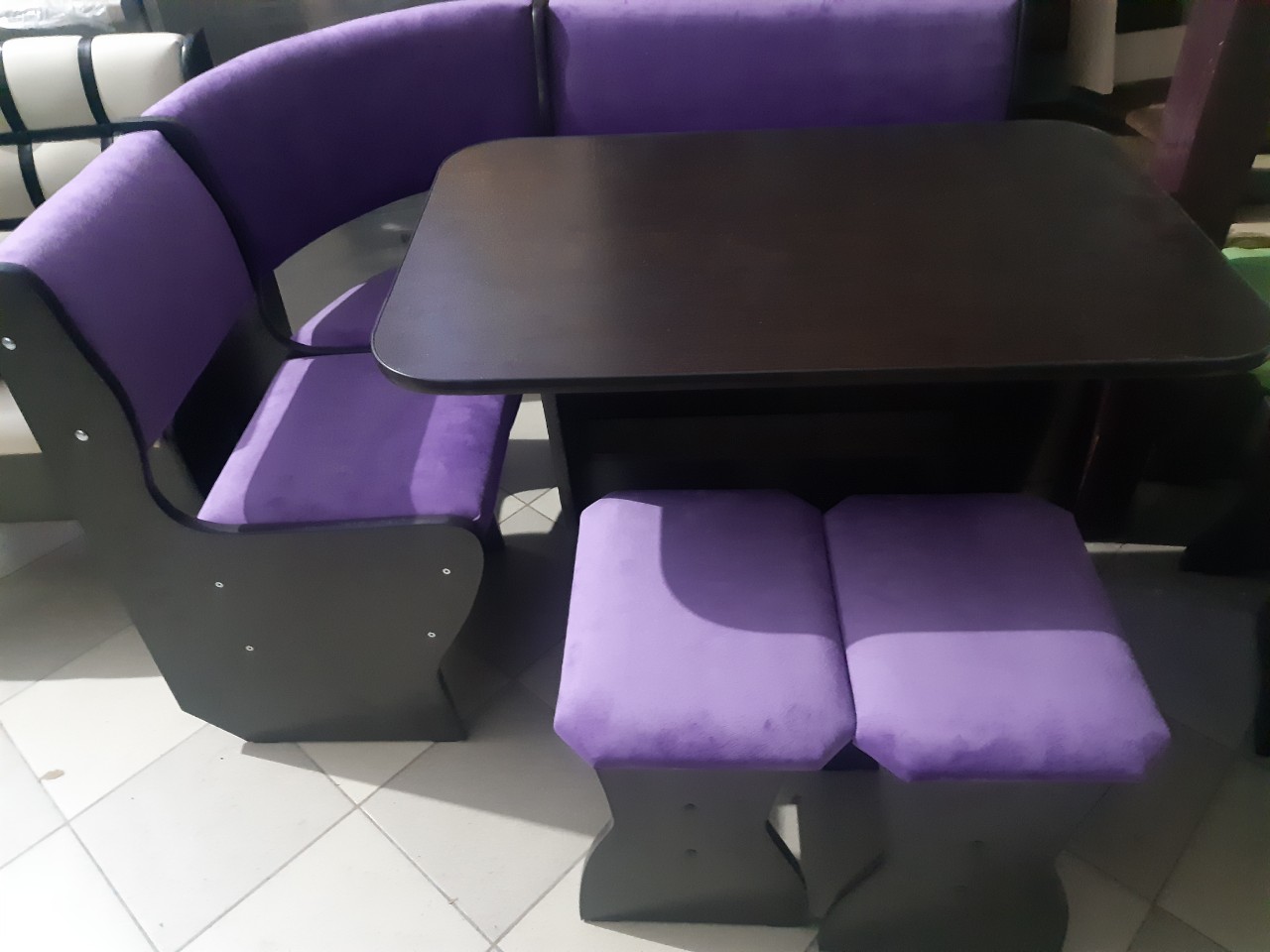 Кухонный уголок. Глянцевое покрытие обивки. В набор входит угловая скамья, стол и два табурета. Множество вариантов цветов.