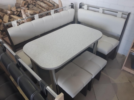 В набор входит угловая скамья, стол и два табурета. Цвет и размер на выбор.