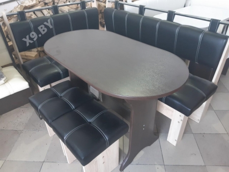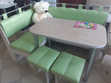 Состоит из углового кухонного дивана, обеденного стола и двух мягких табуретов. Под сиденьем находятся ящики для хранения. Универсальная сборка - право/лево.