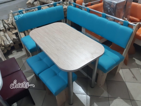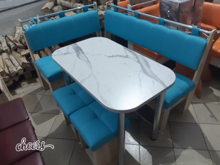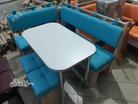 В набор входит угловая скамья, стол и два табурета. Множество вариантов цветов.