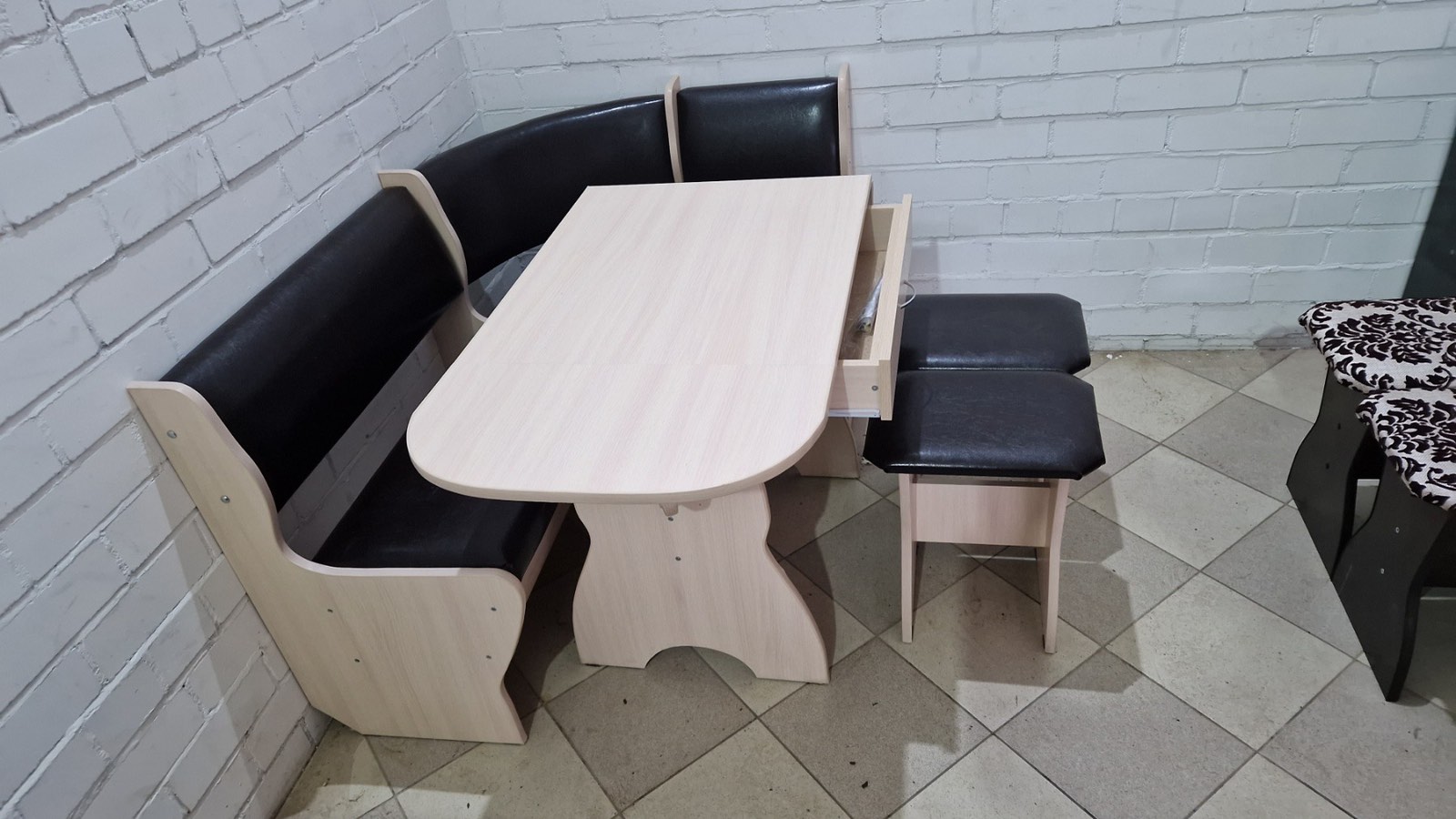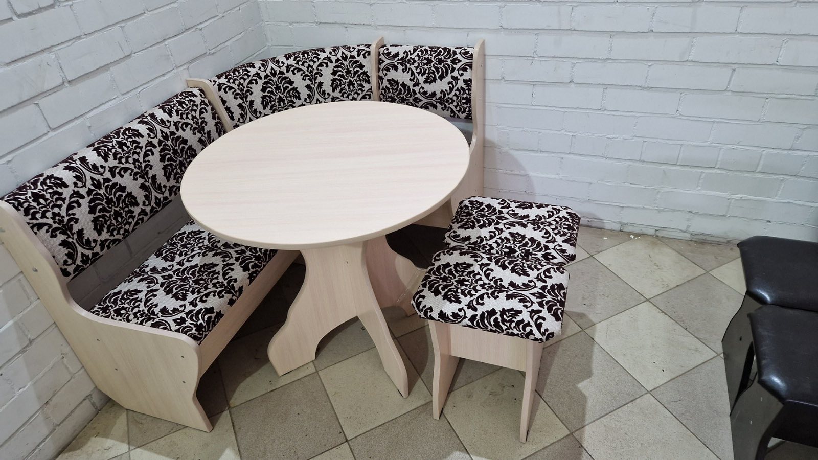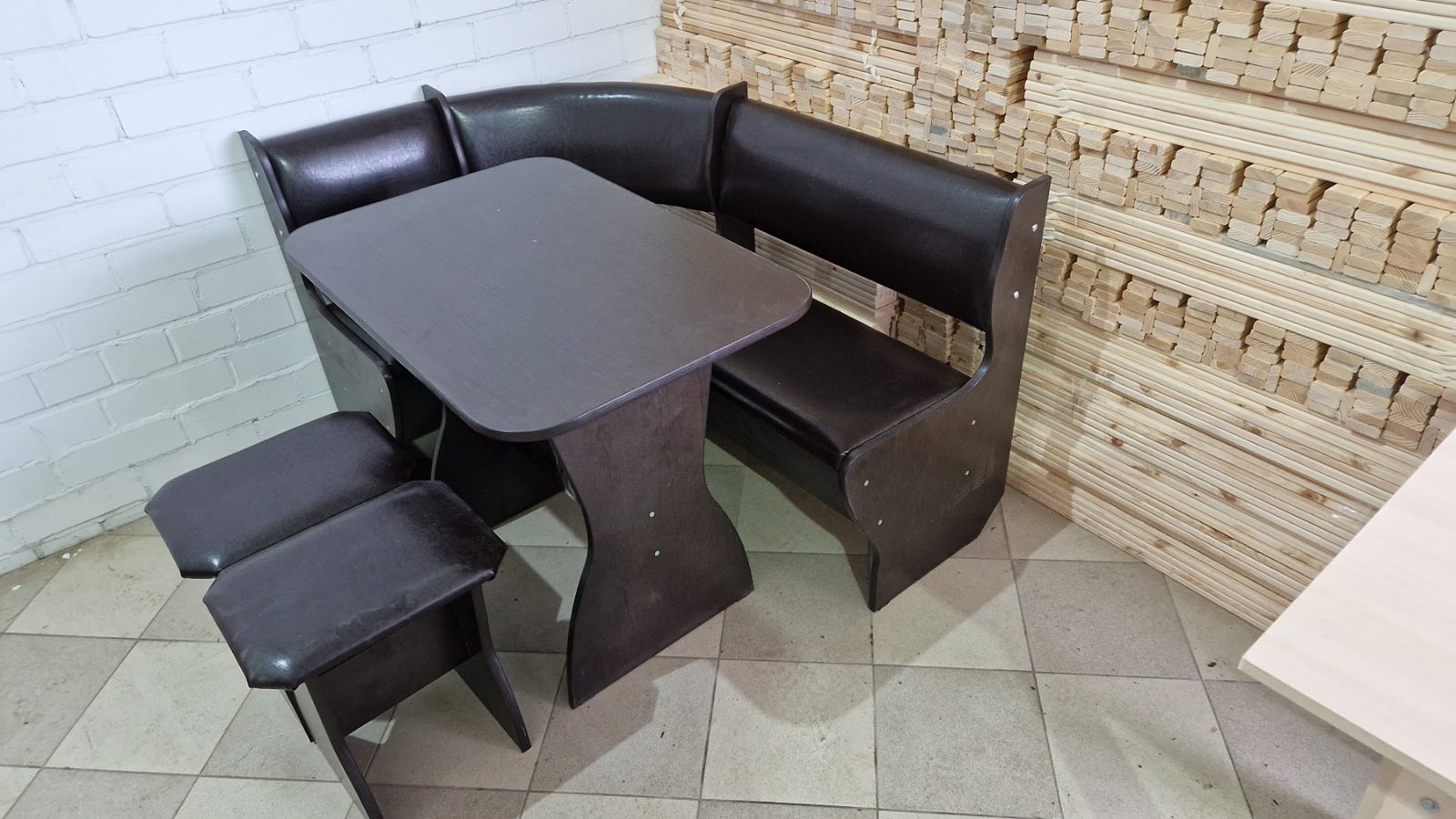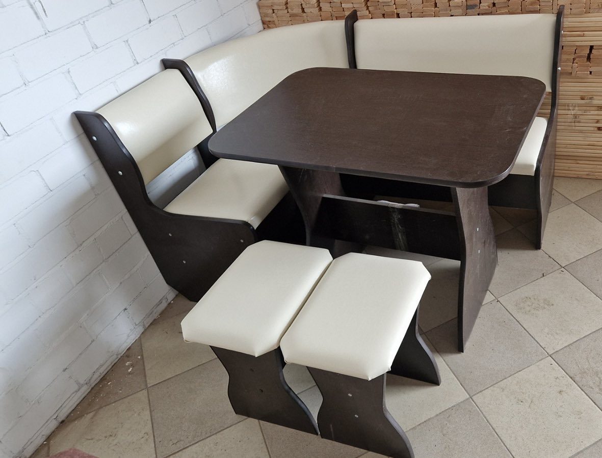 В набор входит угловая скамья, стол и два табурета. Множество вариантов цветов. Мягкие сиденья и спинки с наполнением из ППУ. Обивка из экокожи.