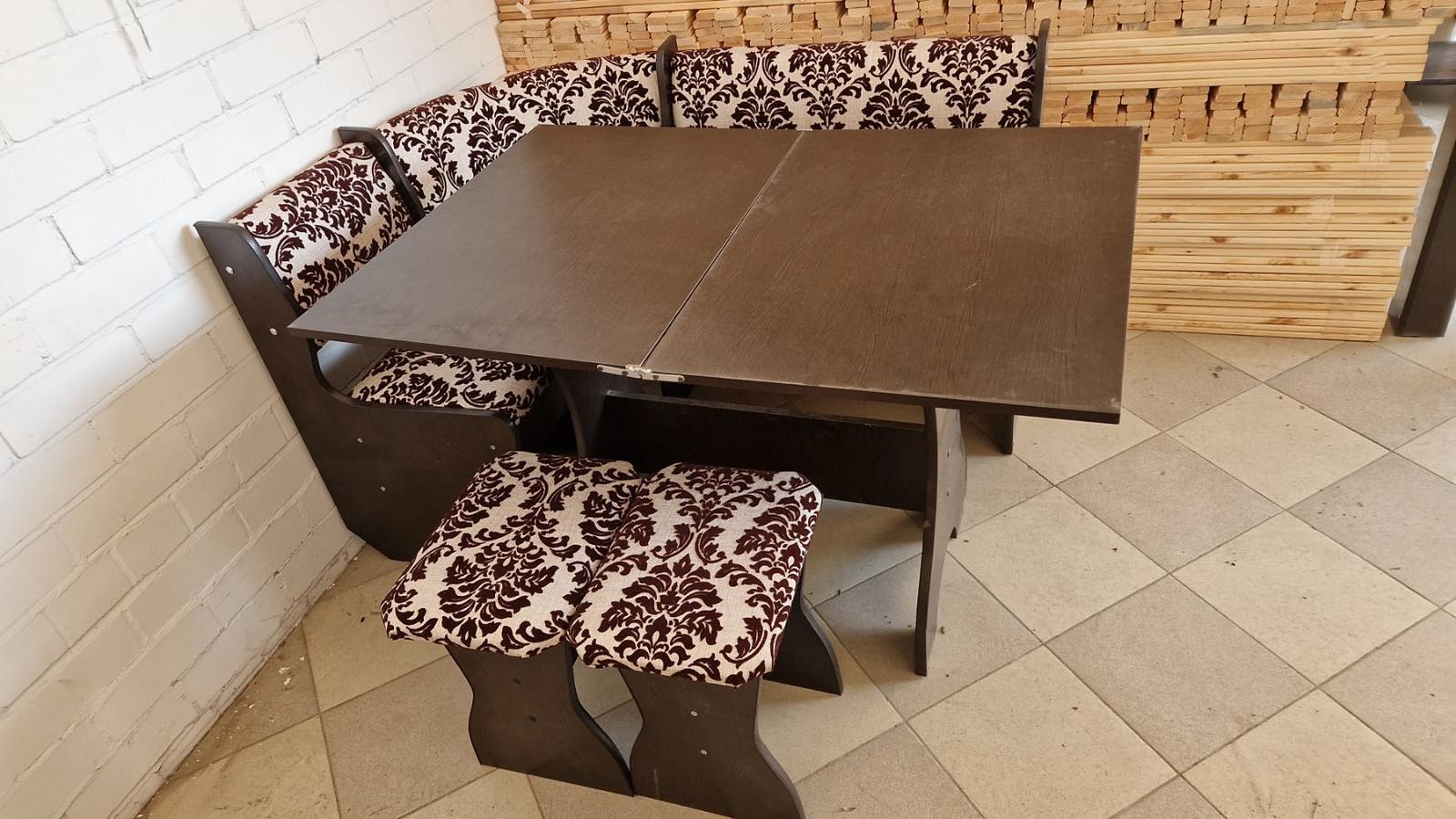 В набор входит угловая скамья, стол и два табурета. Классическая конструкция. Большой выбор расцветок.