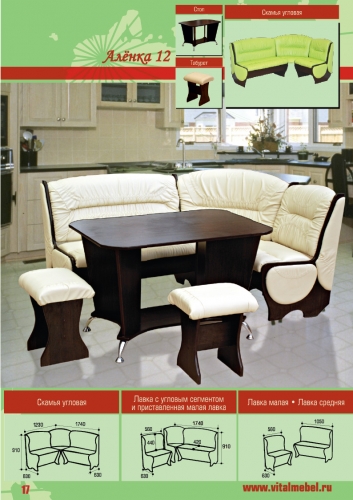 В набор входит: угловая скамья, стол, два табурета. Обивка: экокожа, ткань