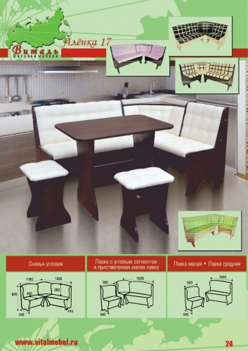 В набор входит угловая скамья, стол и два табурета. Множество вариантов цветов.