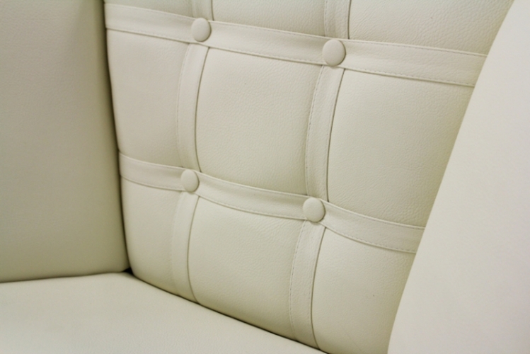 Каркас ламинирован под темное дерево, стол и табуреты изготовлены на двух фигурных опорах, столешница со скошенными безопасными углами. Мягкие спинки и сиденья углового диванчика в белой обивке из эко-кожи в квадратной прошивке.