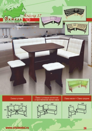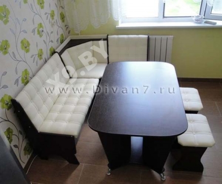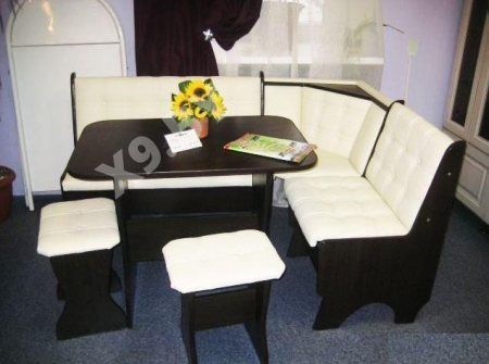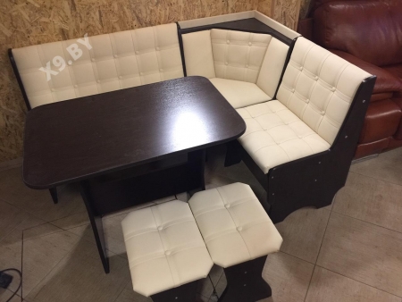 Состоит из углового кухонного дивана, обеденного стола и двух мягких табуретов. Под сиденьем находятся ящики для хранения. Универсальная сборка - право/лево.