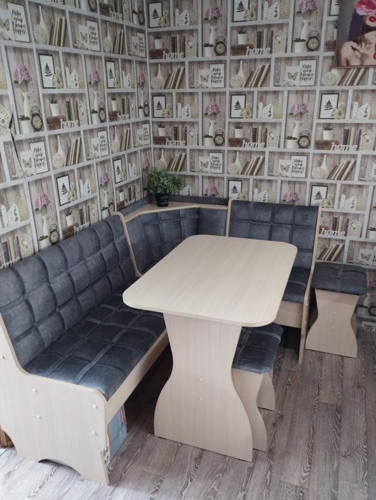 В набор входит: угловая скамья, стол, два табурета. Обивка: экокожа, ткань