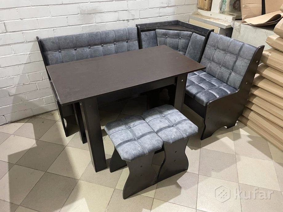 В набор входит угловая скамья, стол и два табурета. Цвет и размер на выбор.