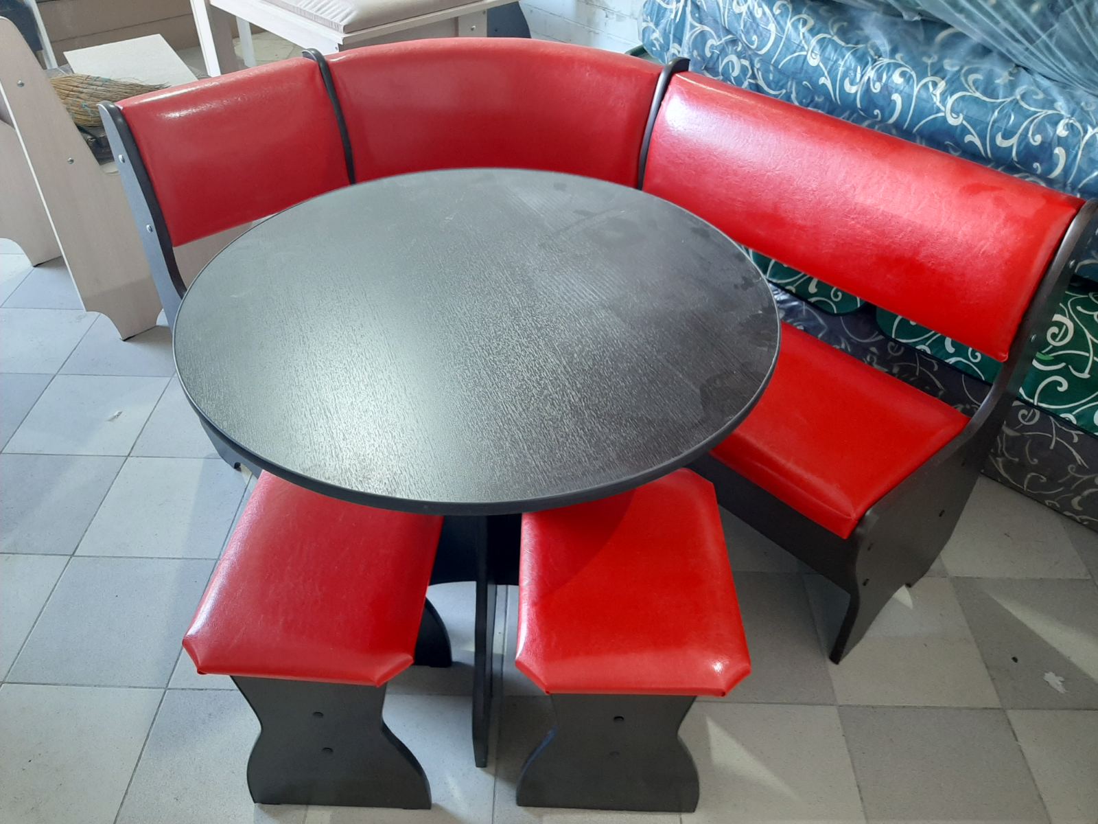 В набор входит угловая скамья, стол и два табурета. Цвет и размер на выбор.
