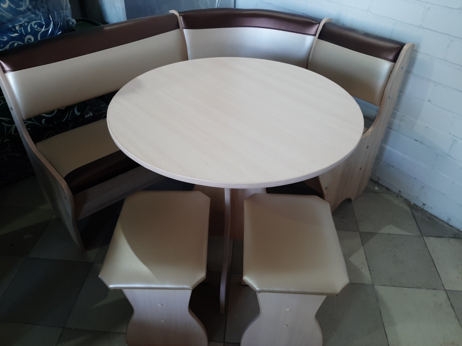 Стильный, функциональный и удобный кухонный уголок, который состоит из: угловой скамьи, стола и двух табуреток.