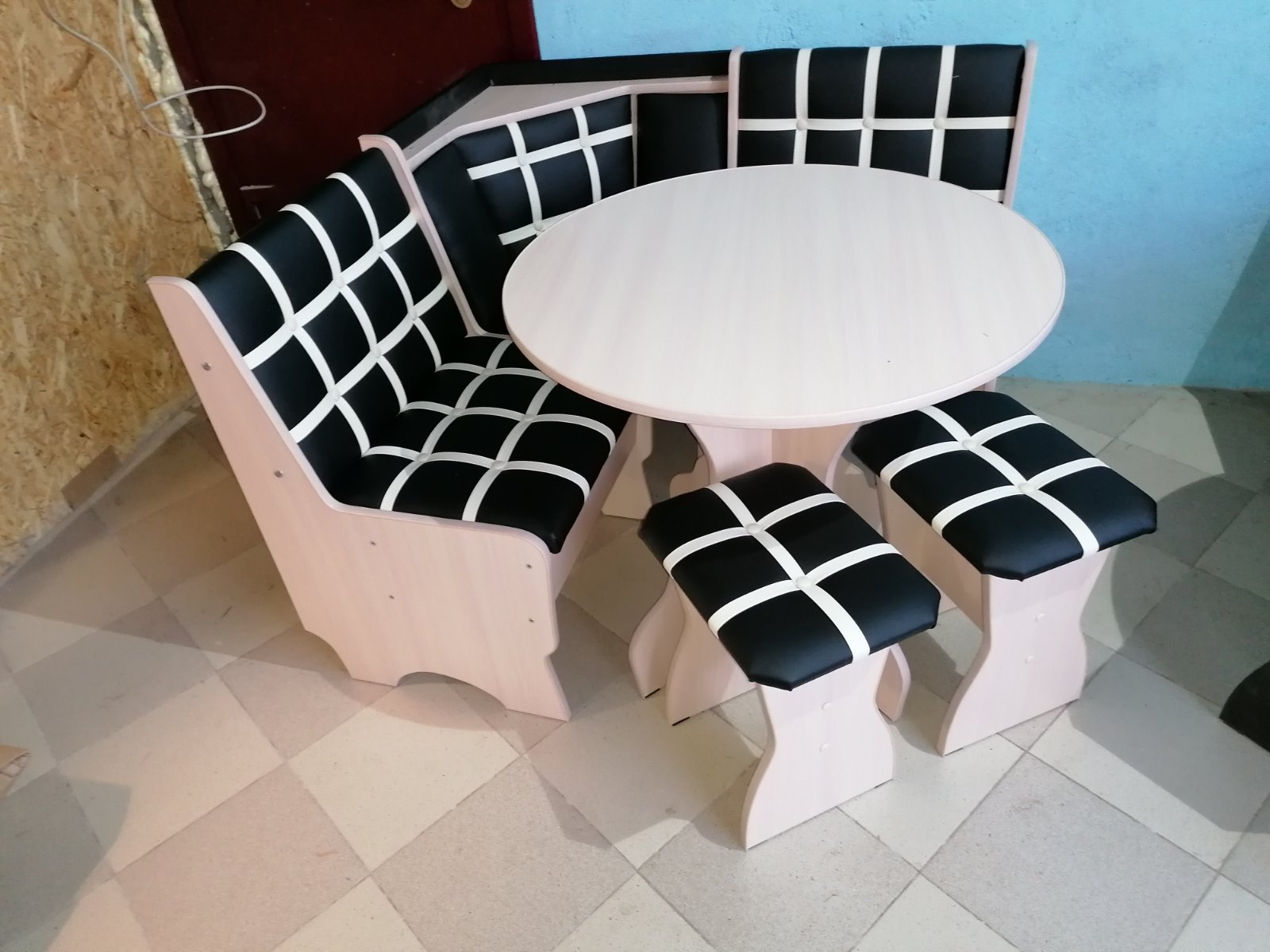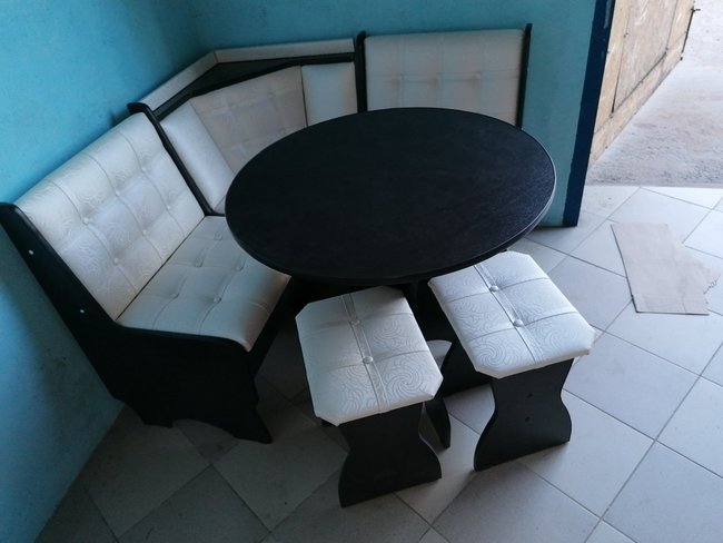В набор входит угловая скамья, стол и два табурета. Цвет и размер на выбор.