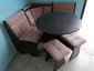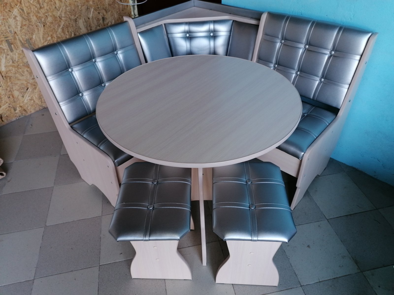 Стильный, функциональный и удобный кухонный уголок, который состоит из: угловой скамьи, стола и двух табуреток.