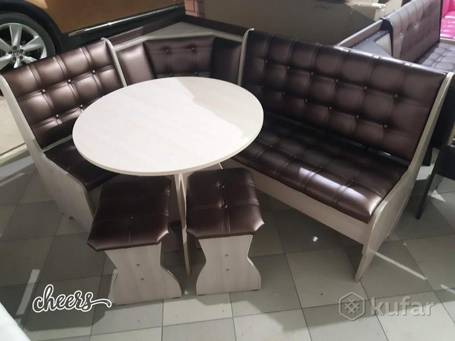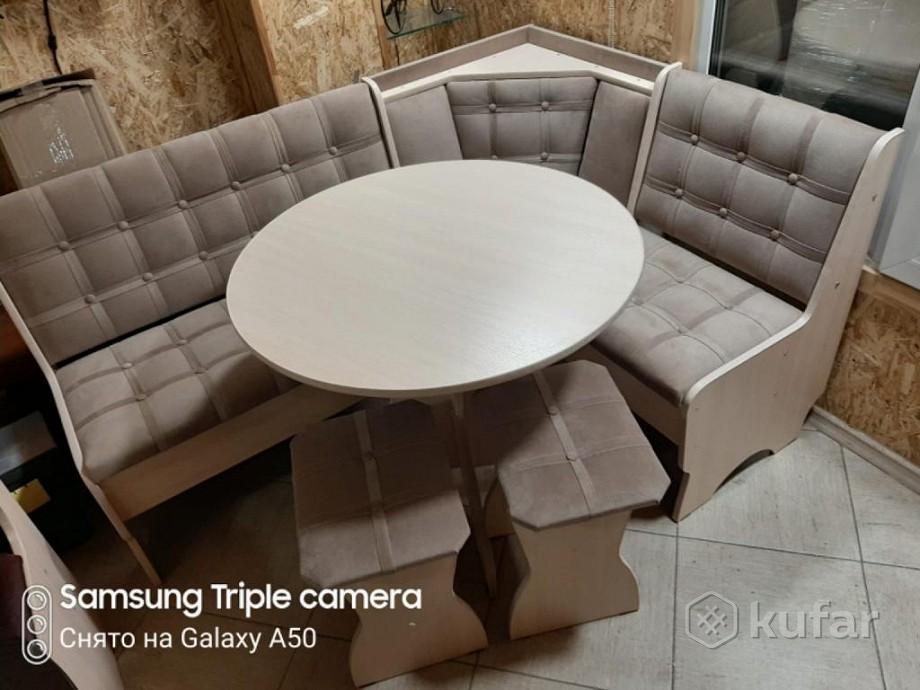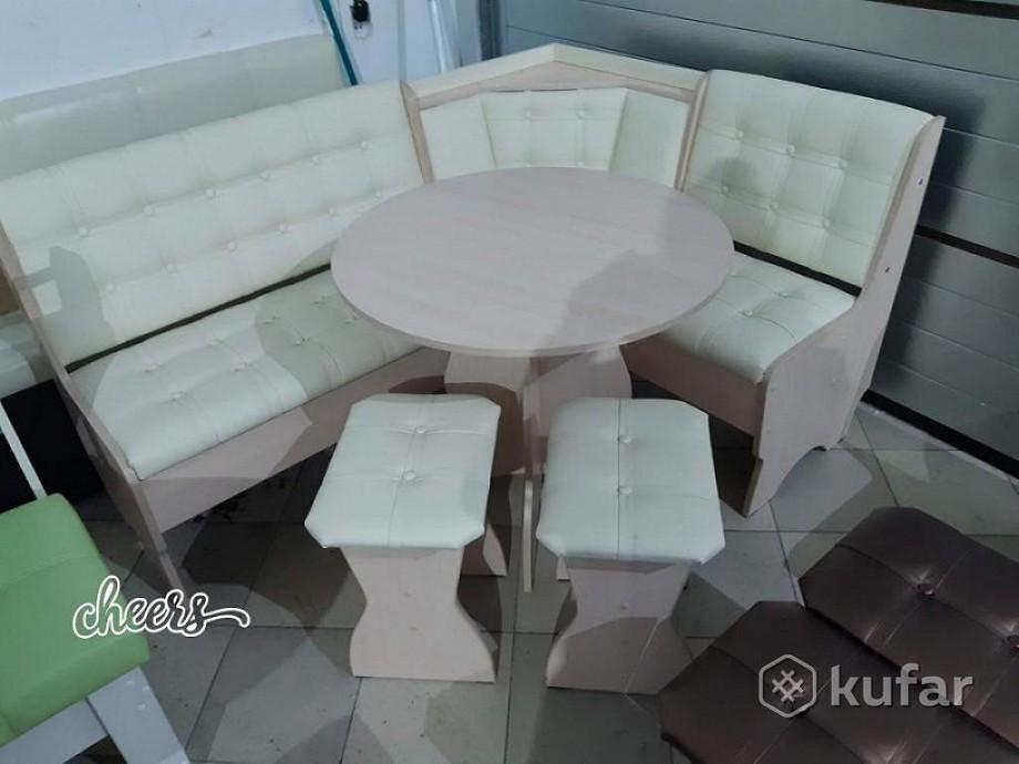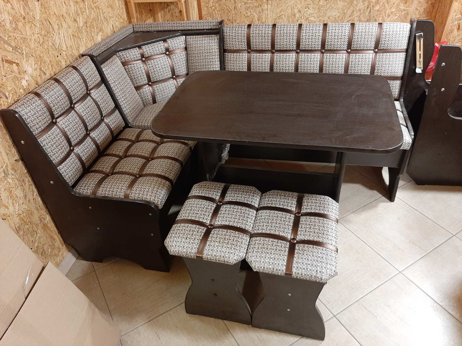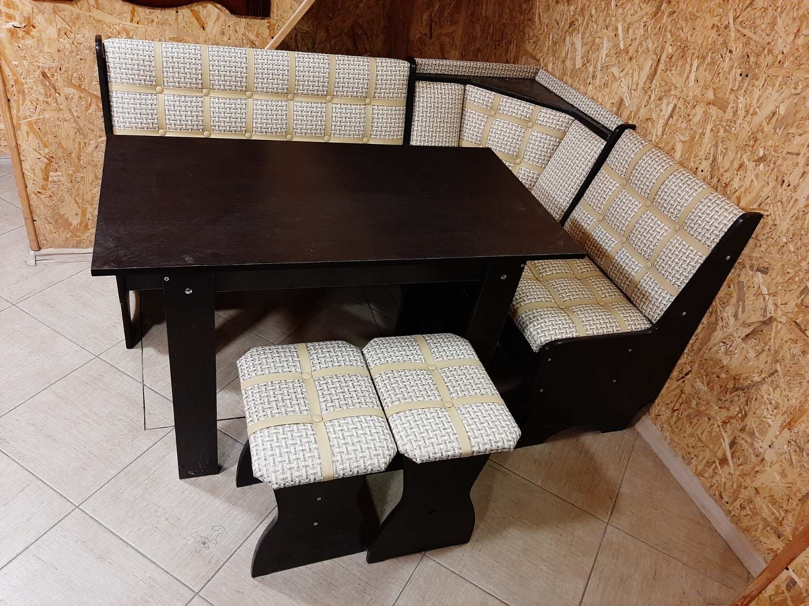 В набор входит угловая скамья, стол и два табурета. Цвет и размер на выбор.