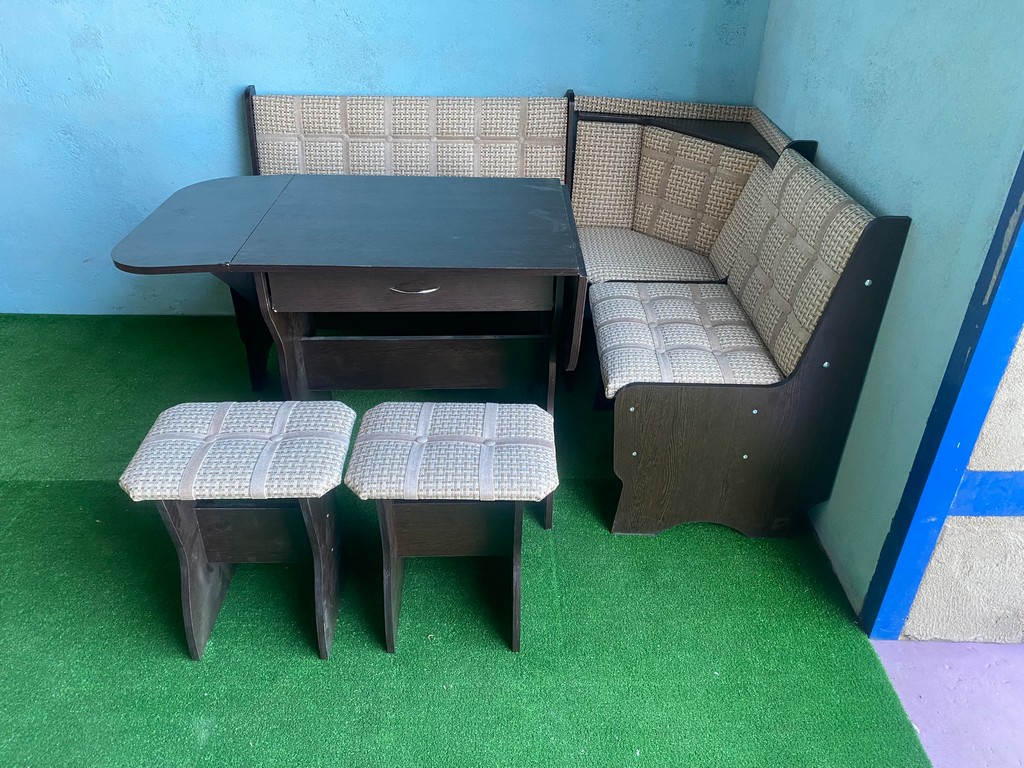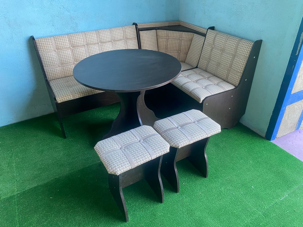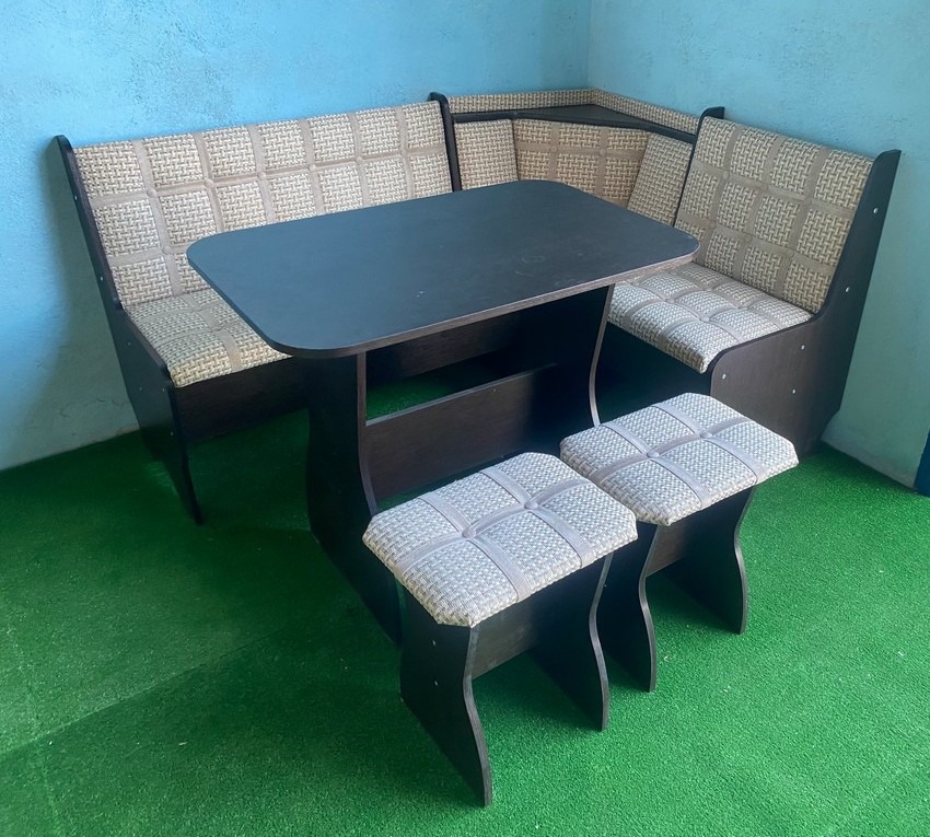 В набор входит угловая скамья, стол и два табурета. Цвет и размер на выбор.
