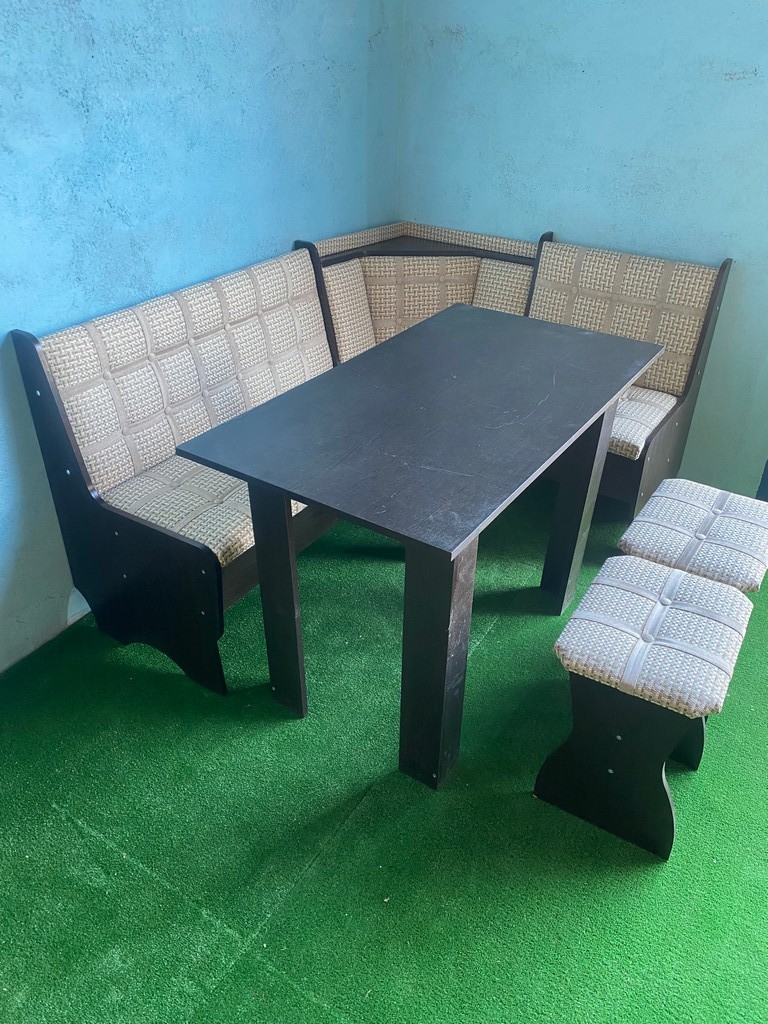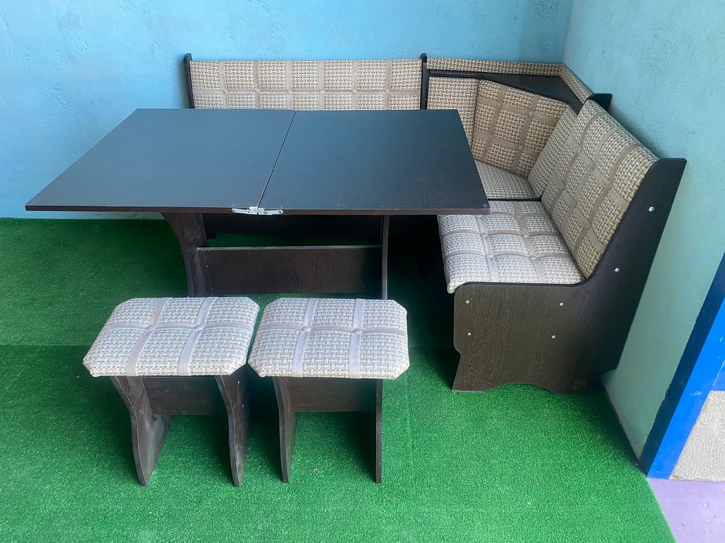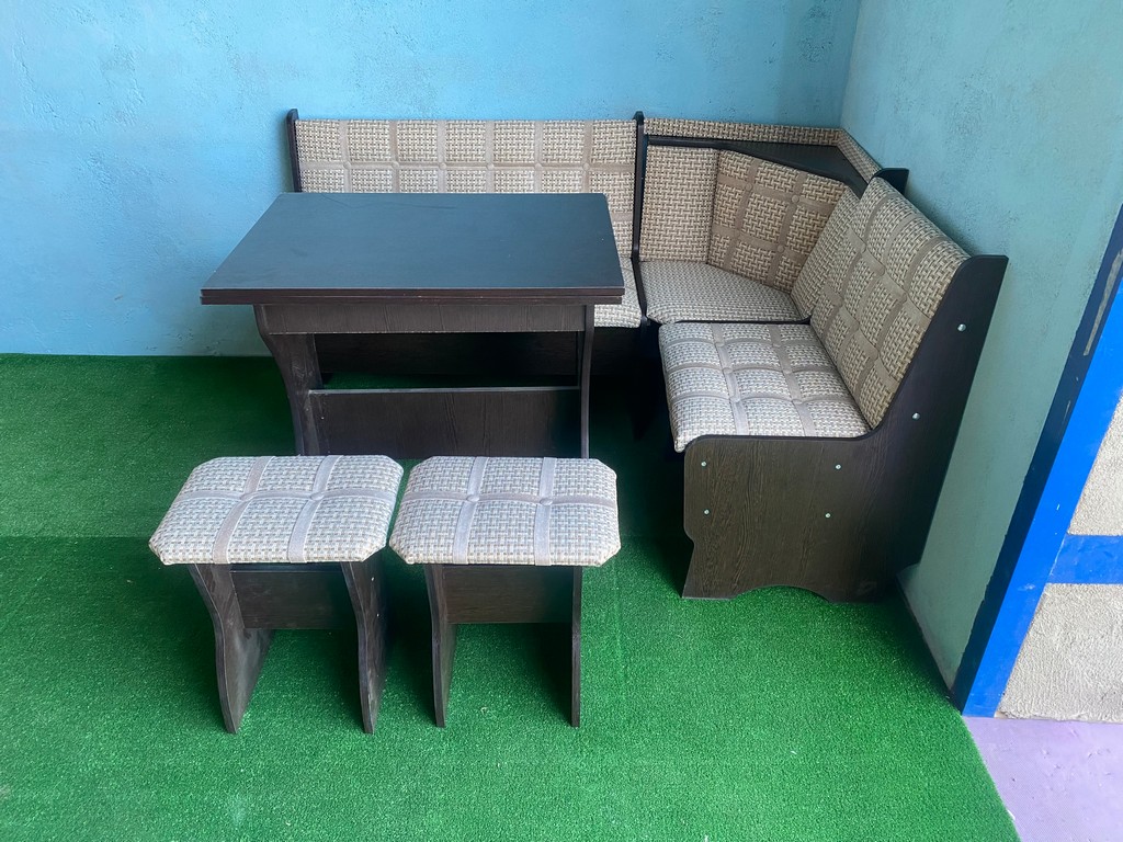 В набор входит: угловая скамья, стол, два табурета. Обивка: экокожа, ткань