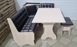 Состоит из углового кухонного дивана, обеденного стола и двух мягких табуретов. Под сиденьем находятся ящики для хранения. Универсальная сборка - право/лево.