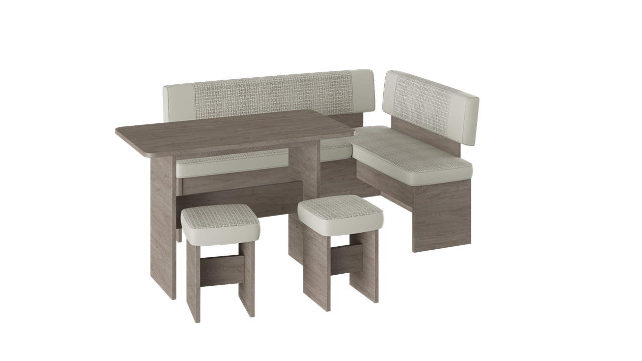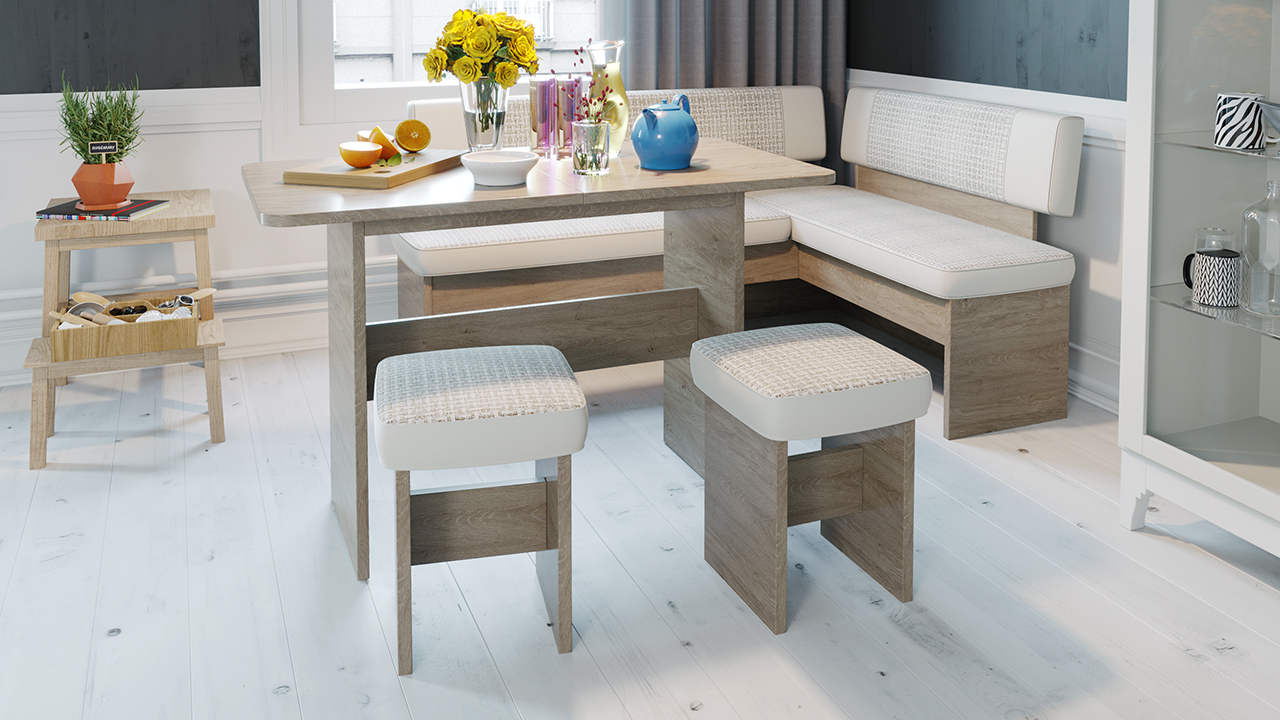 В набор входит угловая скамья, стол и два табурета. Множество вариантов цветов.