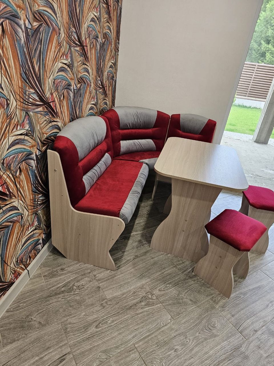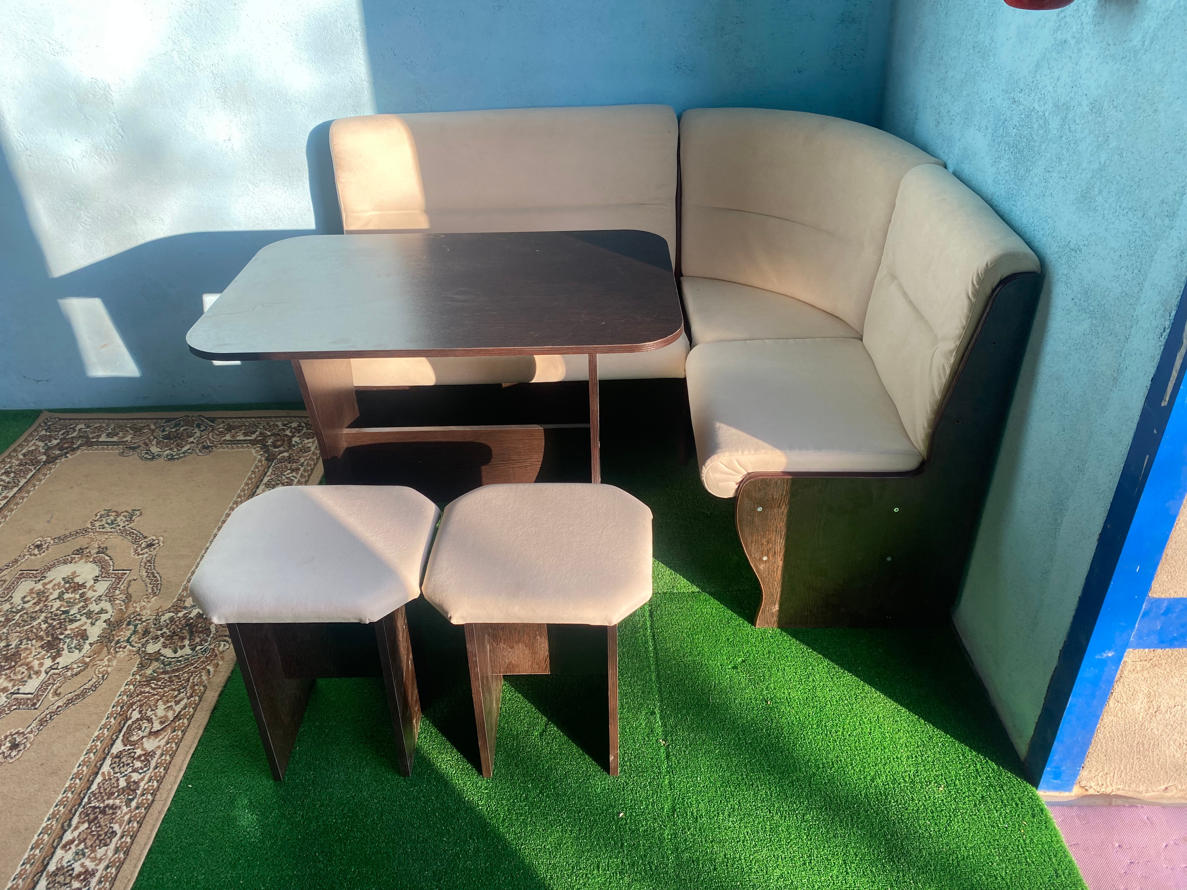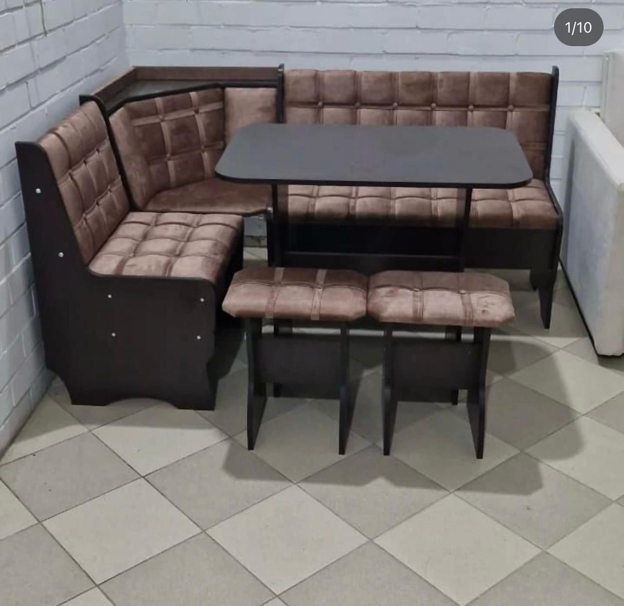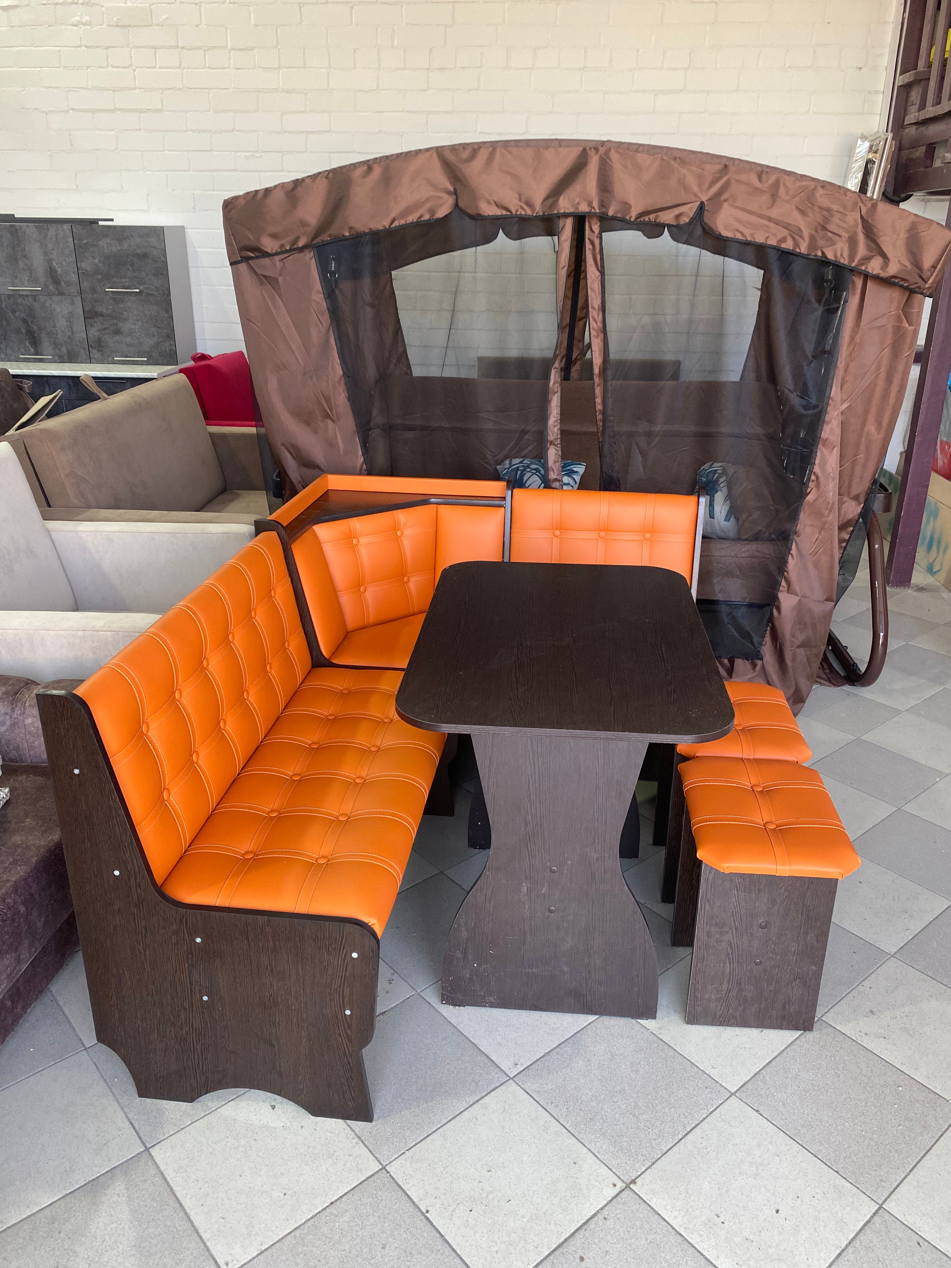 В набор входит угловая скамья, стол и два табурета. Цвет и размер на выбор.