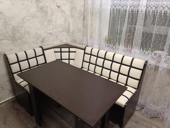 Состоит из углового кухонного дивана, обеденного стола и двух мягких табуретов. Под сиденьем находятся ящики для хранения. Универсальная сборка - право/лево.