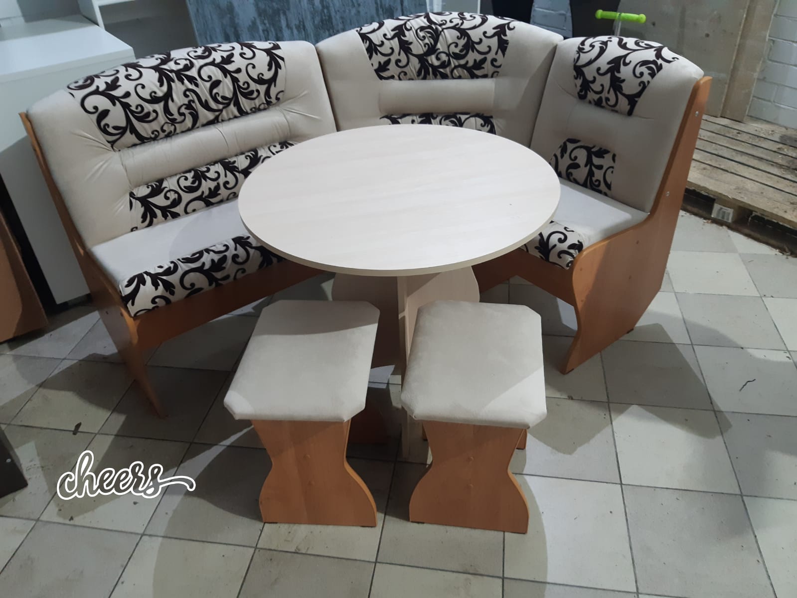 Состоит из углового кухонного дивана, обеденного стола и двух мягких табуретов. Под сиденьем находятся ящики для хранения. Универсальная сборка - право/лево.