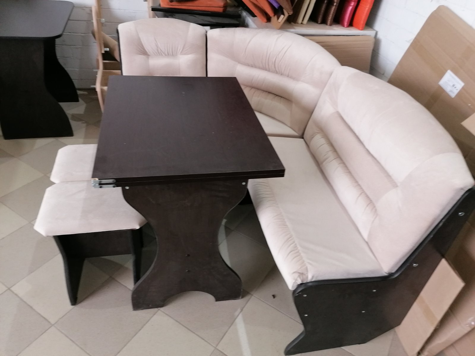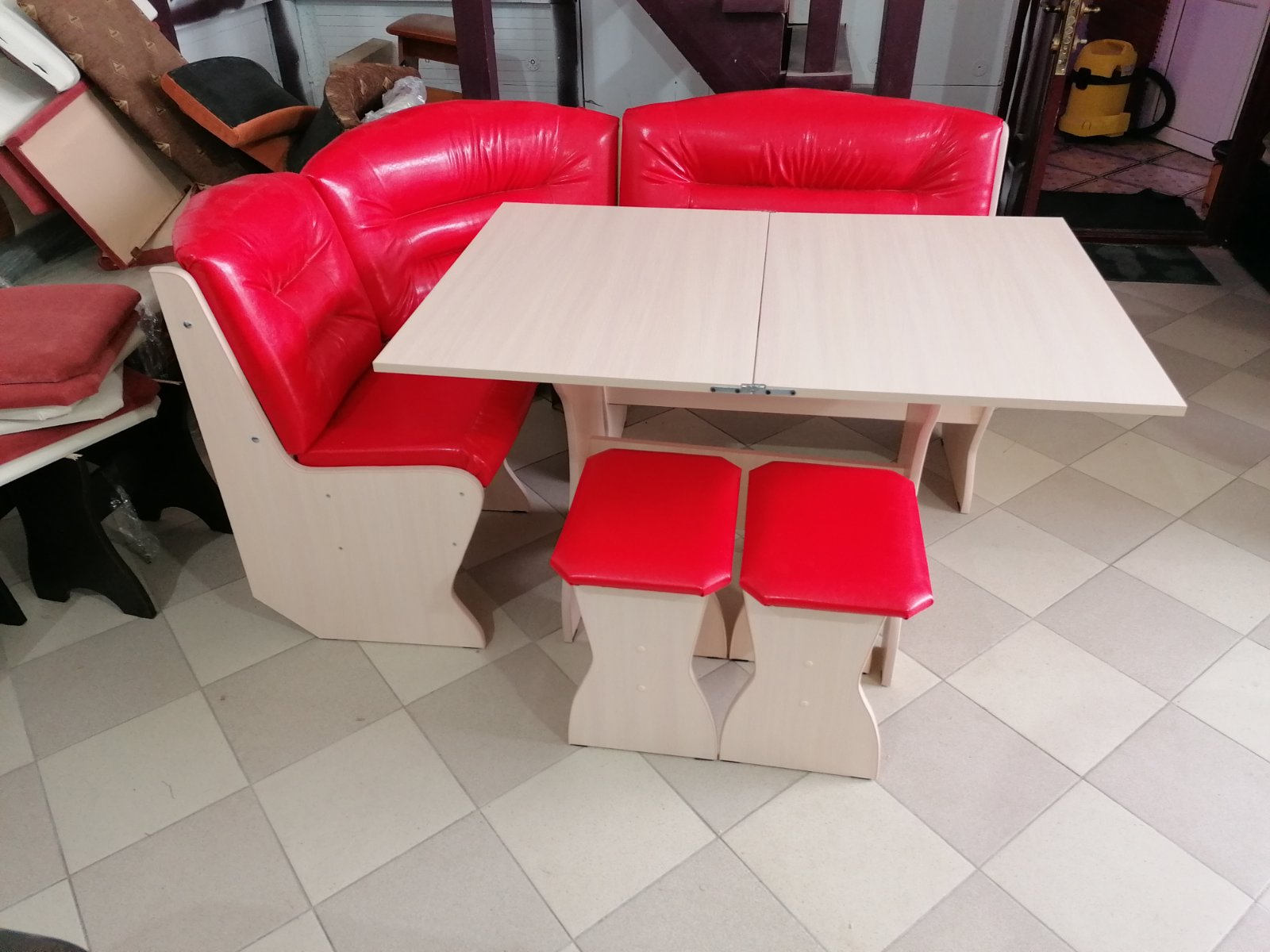 В набор входит: угловая скамья, стол, два табурета. Обивка: экокожа, ткань