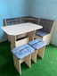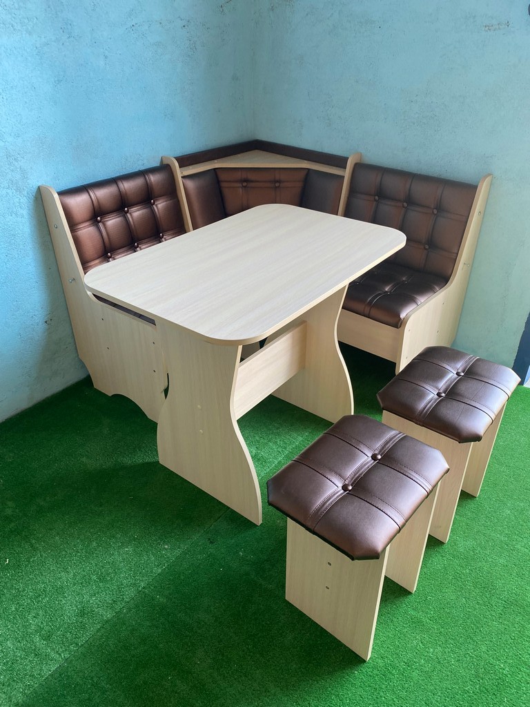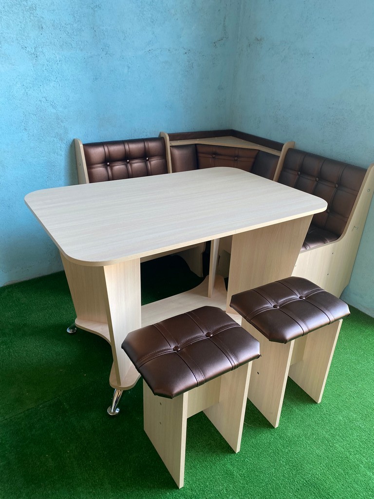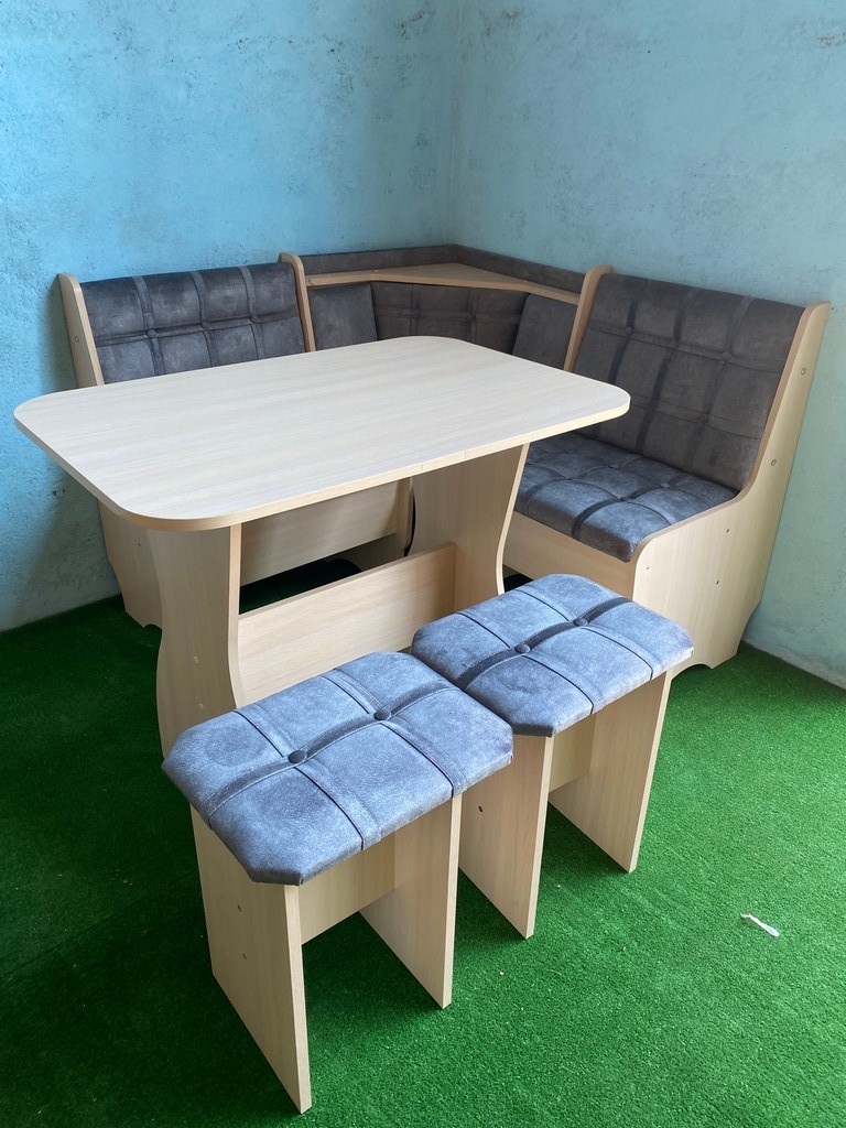 В набор входит угловая скамья, стол и два табурета. Цвет и размер на выбор.