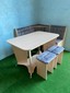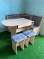 Состоит из: угловой скамьи, стола и двух табуреток. Два короба для хранения.
