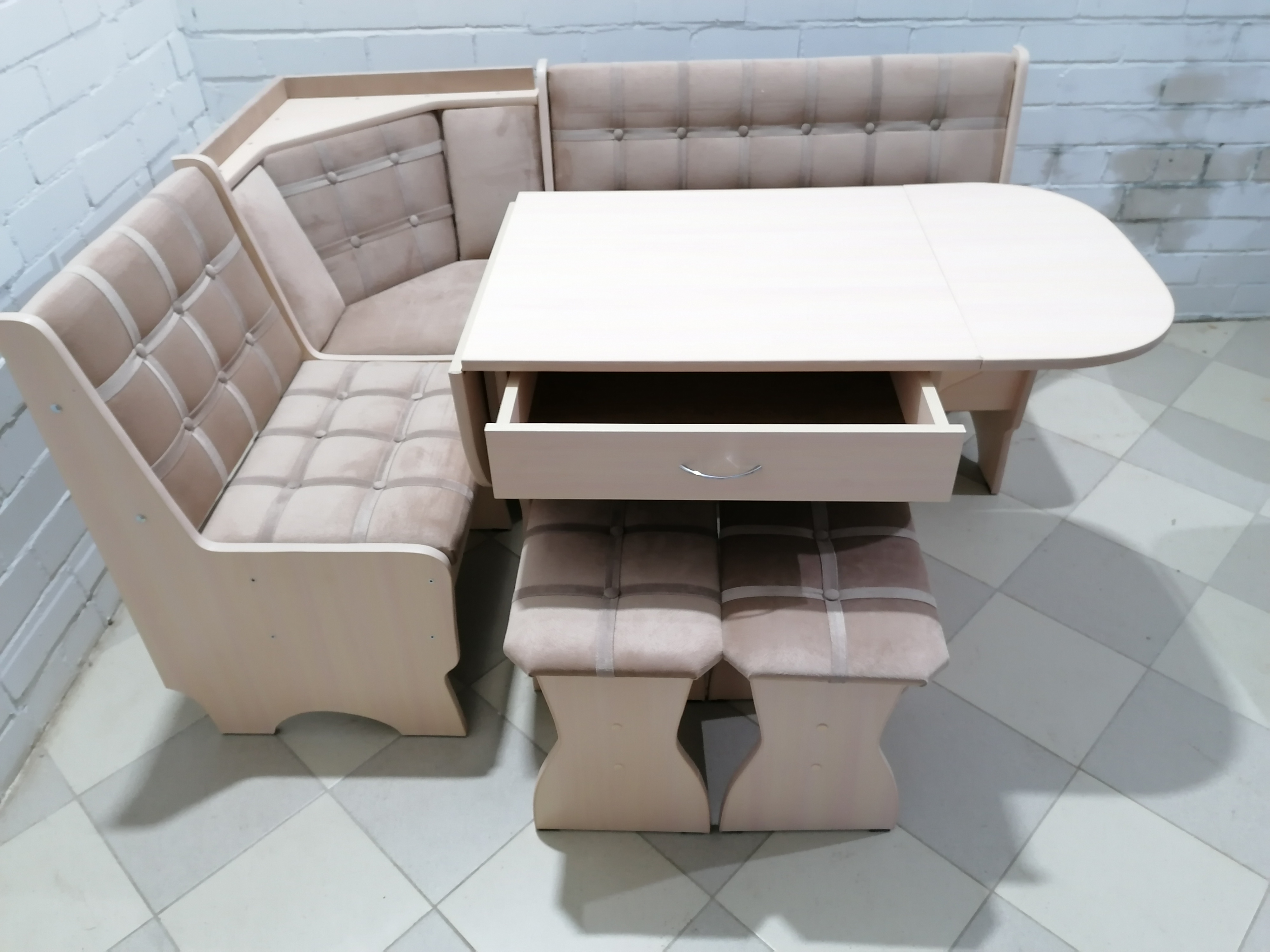 Комплект: угловая кухонная скамья, стол и два табурета. Выбор цвета обивки и ЛДСП.