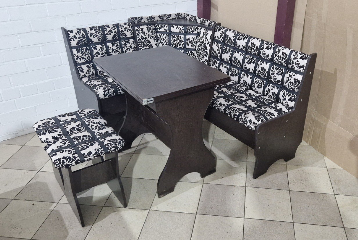 Состоит из углового кухонного дивана, обеденного стола и двух мягких табуретов. Под сиденьем находятся ящики для хранения. Универсальная сборка - право/лево.