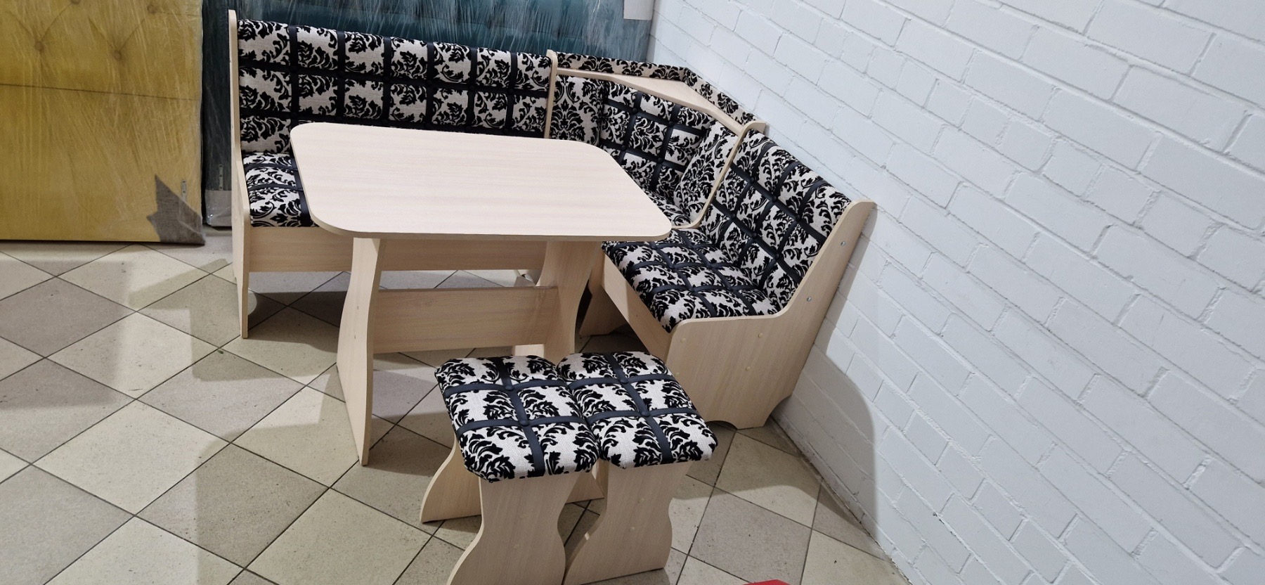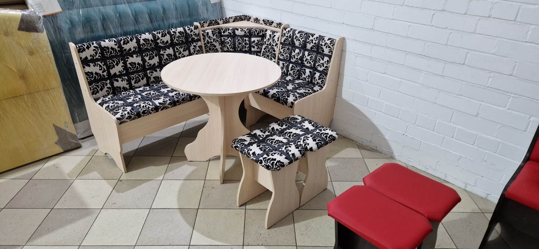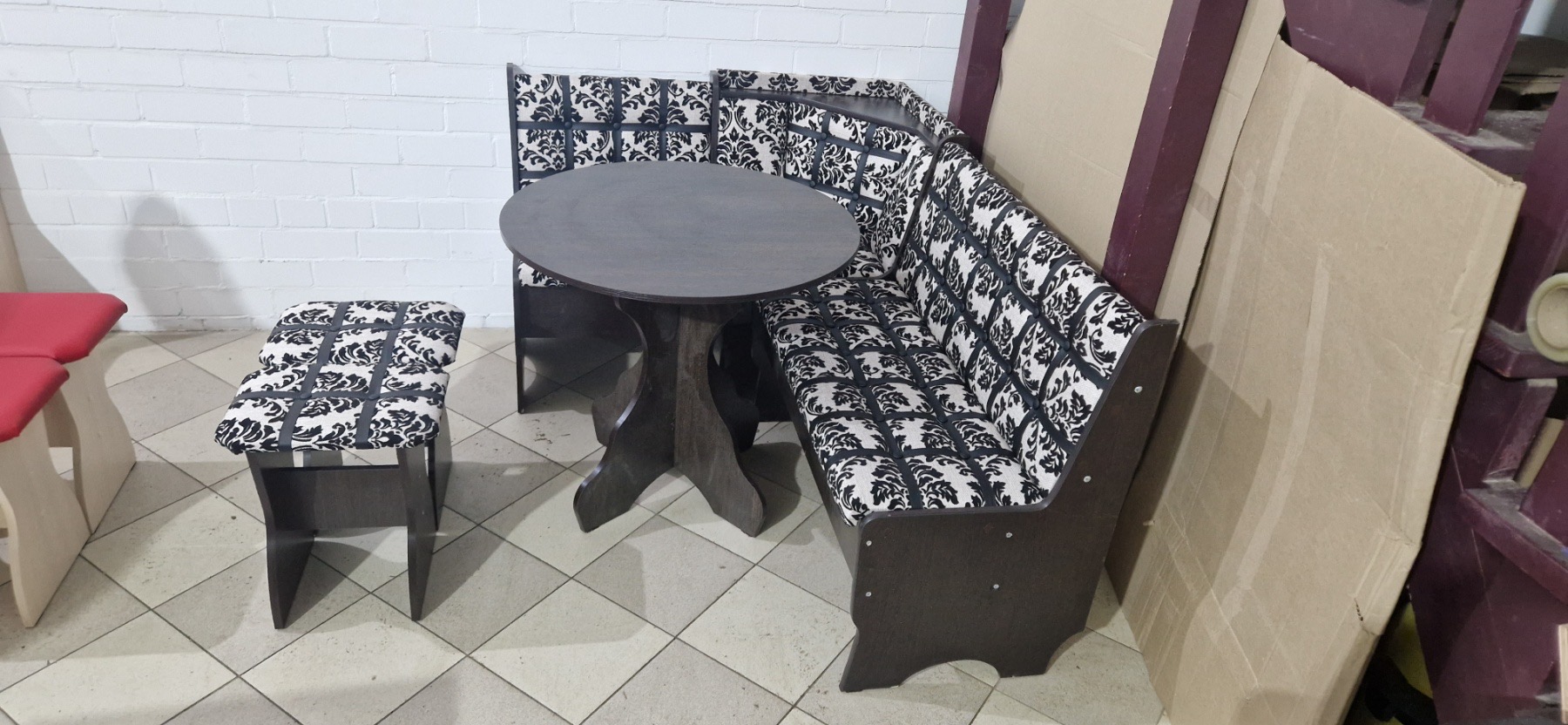 В набор входит угловая скамья, стол и два табурета. Цвет и размер на выбор.