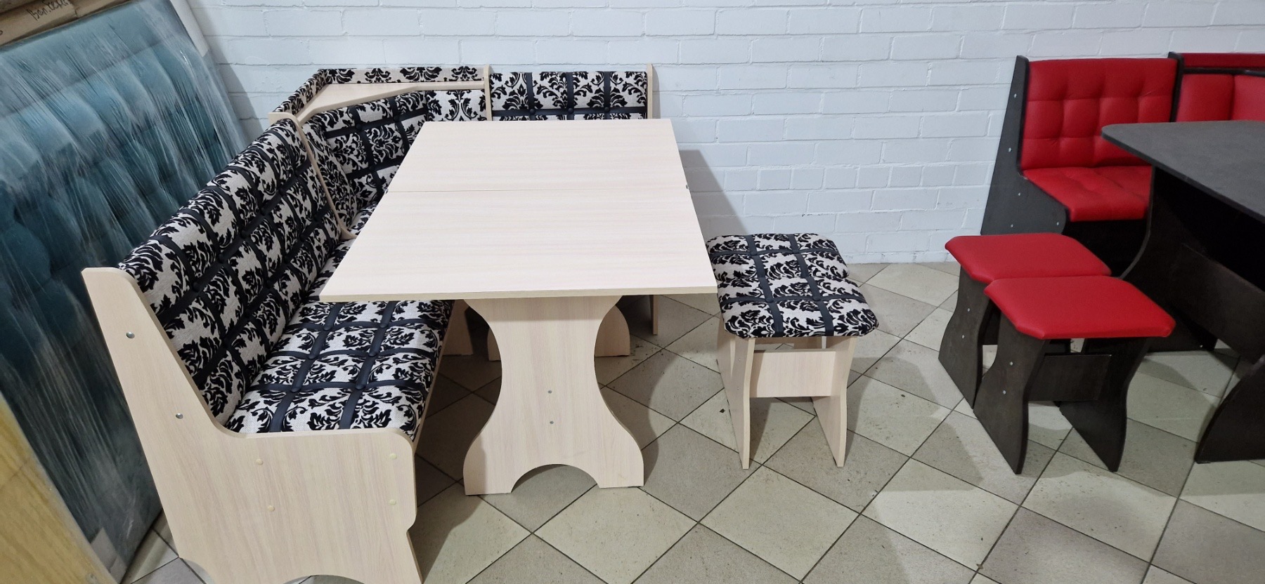 В набор входит угловая скамья, стол и два табурета. Множество вариантов цветов.