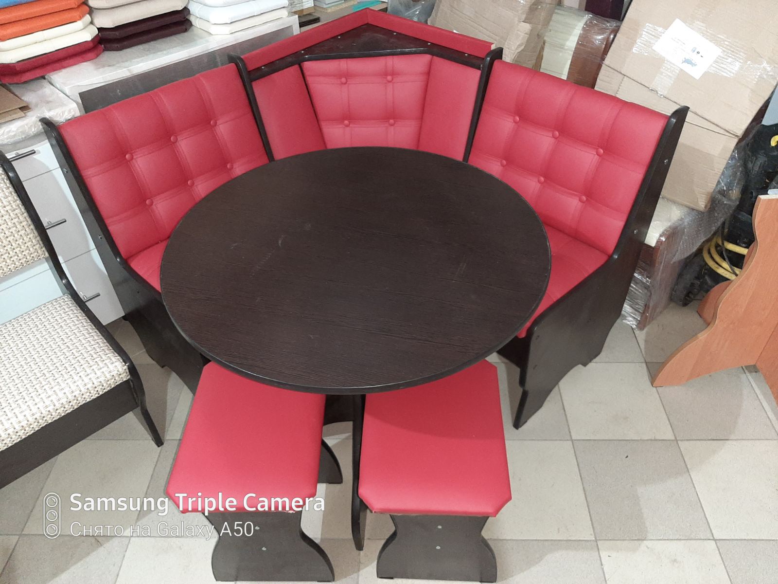 В набор входит угловая скамья, стол и два табурета. Цвет и размер на выбор.
