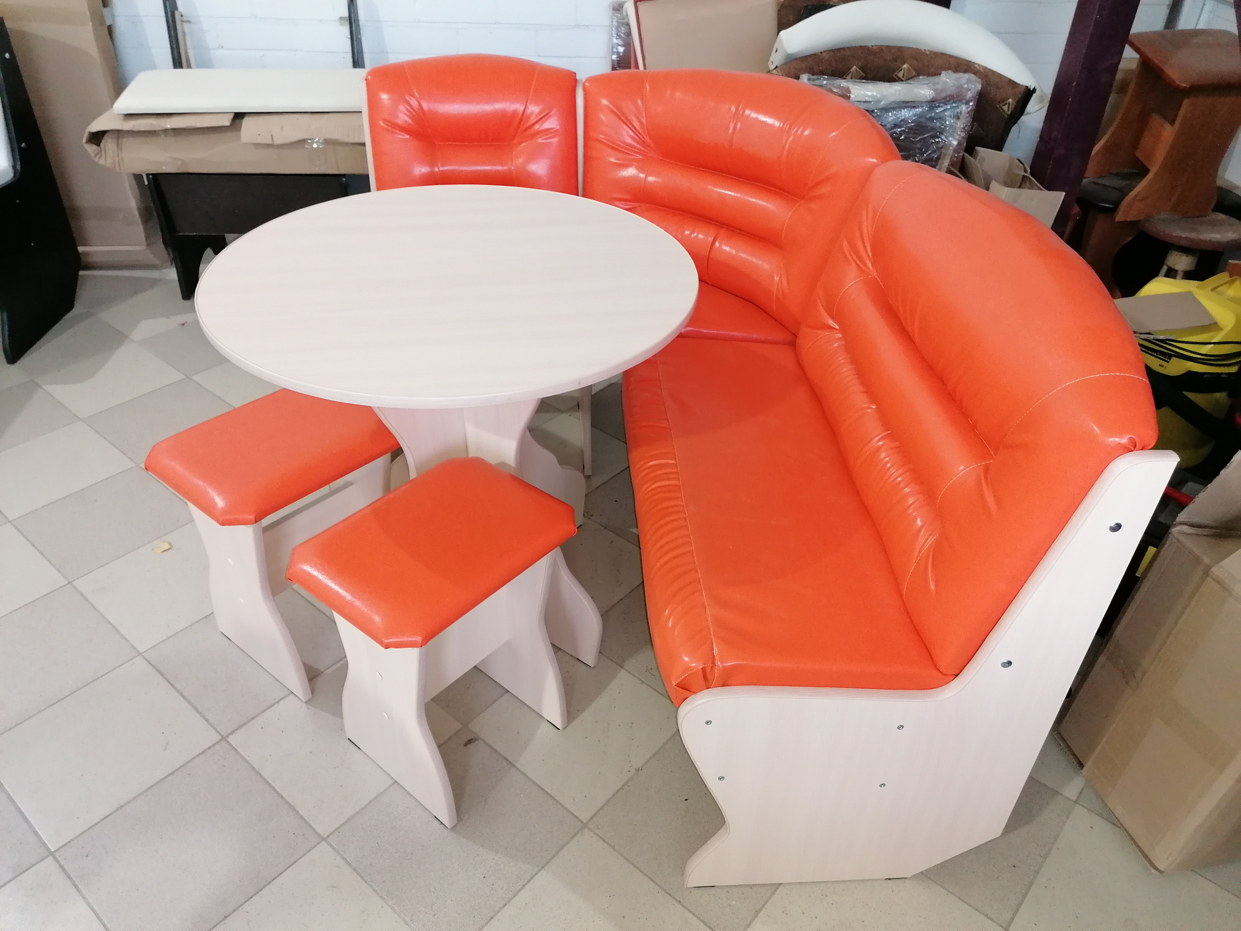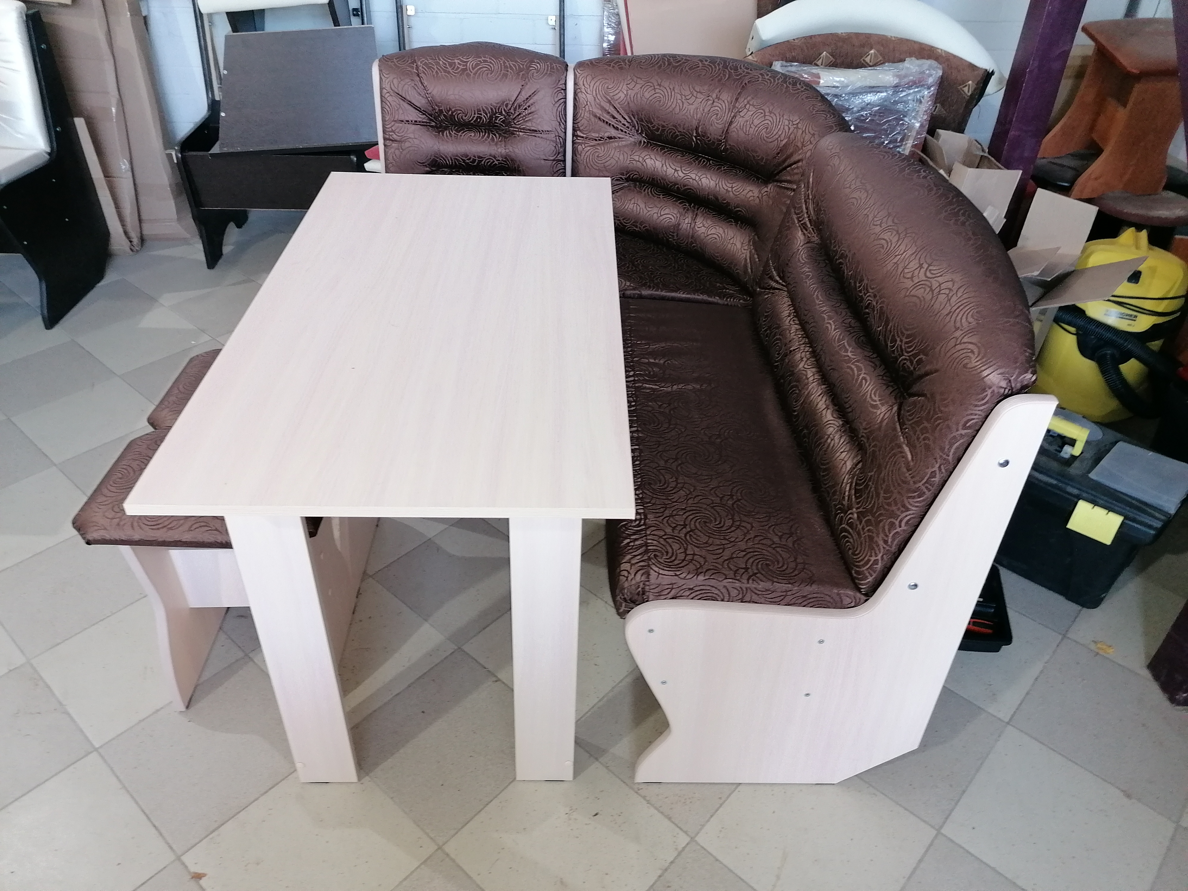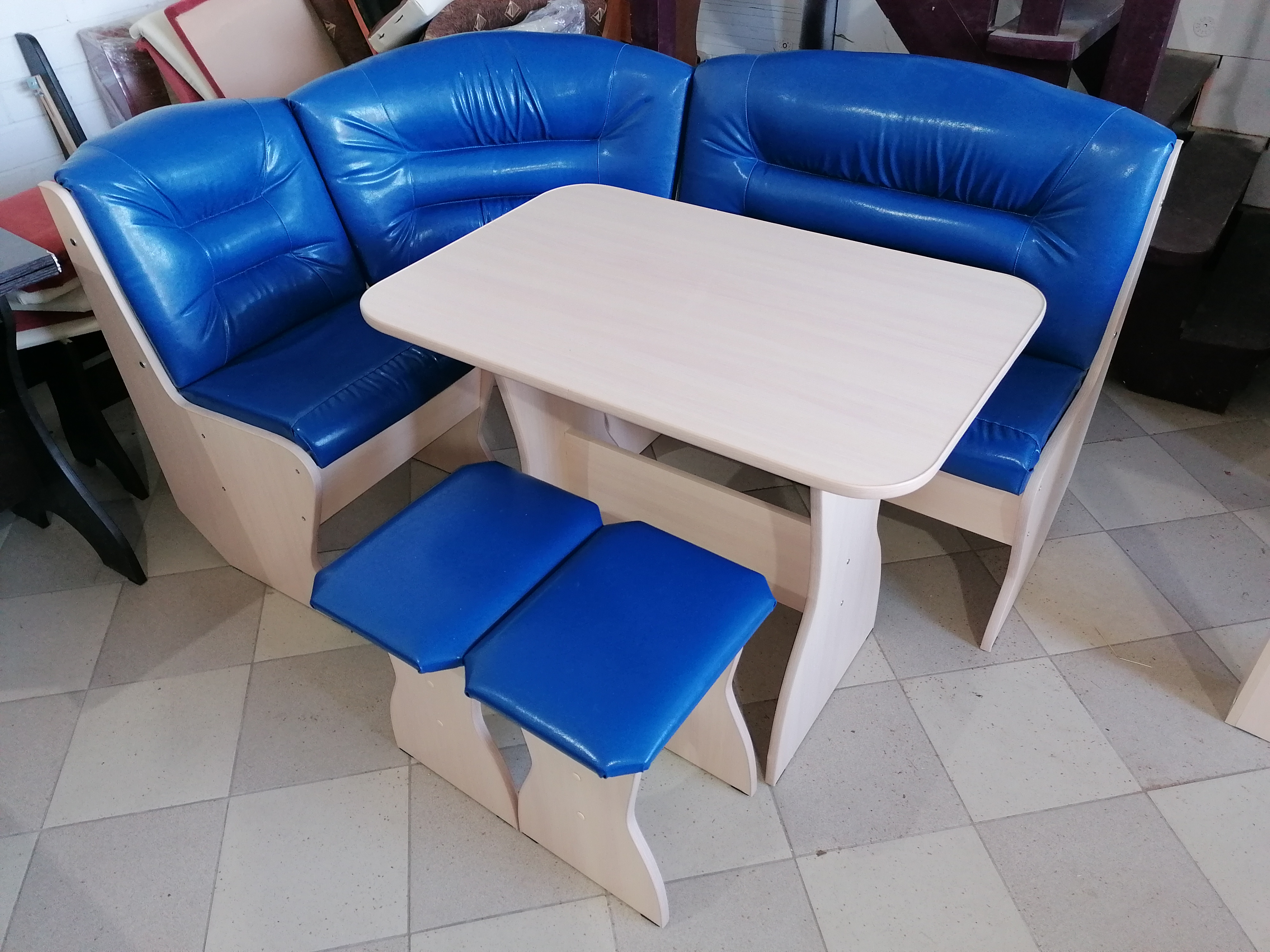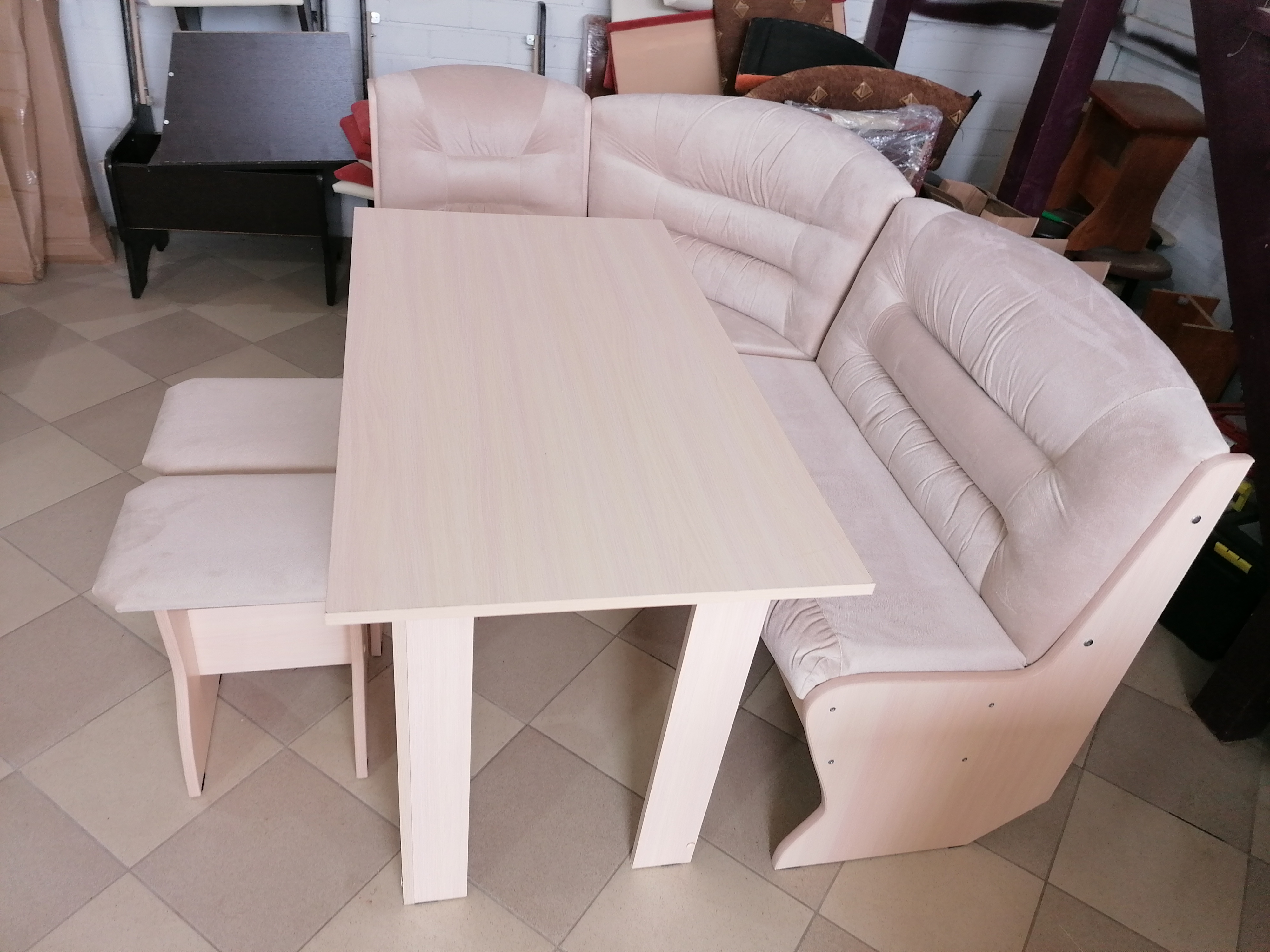 Комплект: угловая кухонная скамья, стол и два табурета.