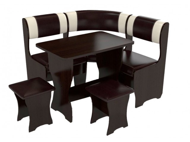 код 146664Компактная модель для небольшой по площади кухни. Угловая скамья, стол и два табурета.