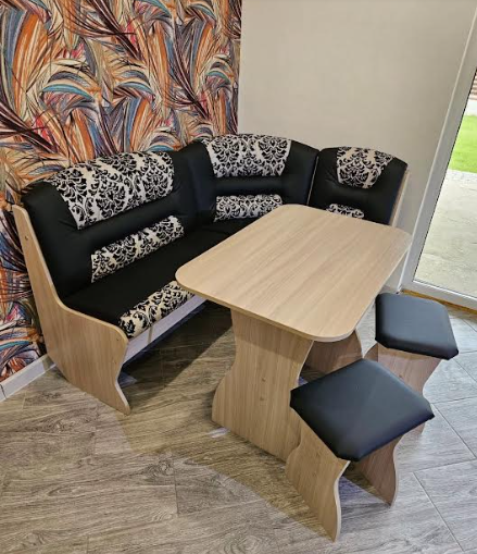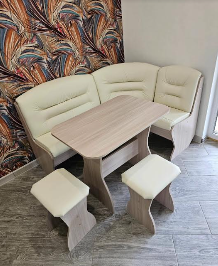 Состоит из углового кухонного дивана, обеденного стола и двух мягких табуретов. Под сиденьем находятся ящики для хранения. Универсальная сборка - право/лево.