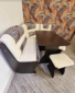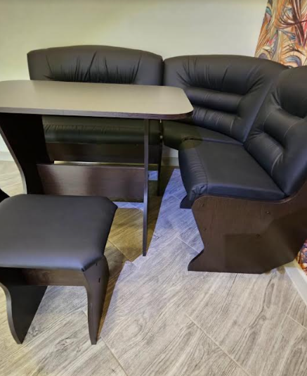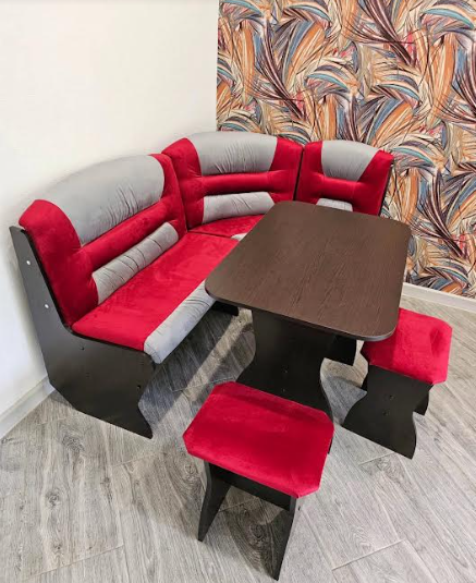 В набор входит: угловая скамья, стол, два табурета. Обивка: экокожа, ткань