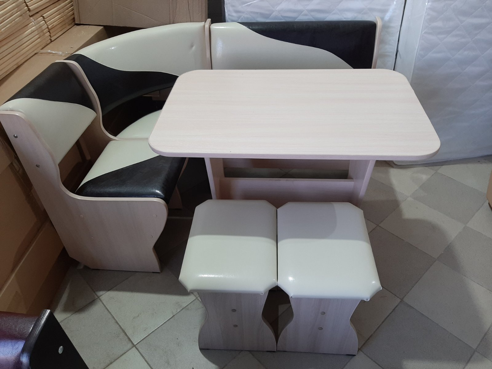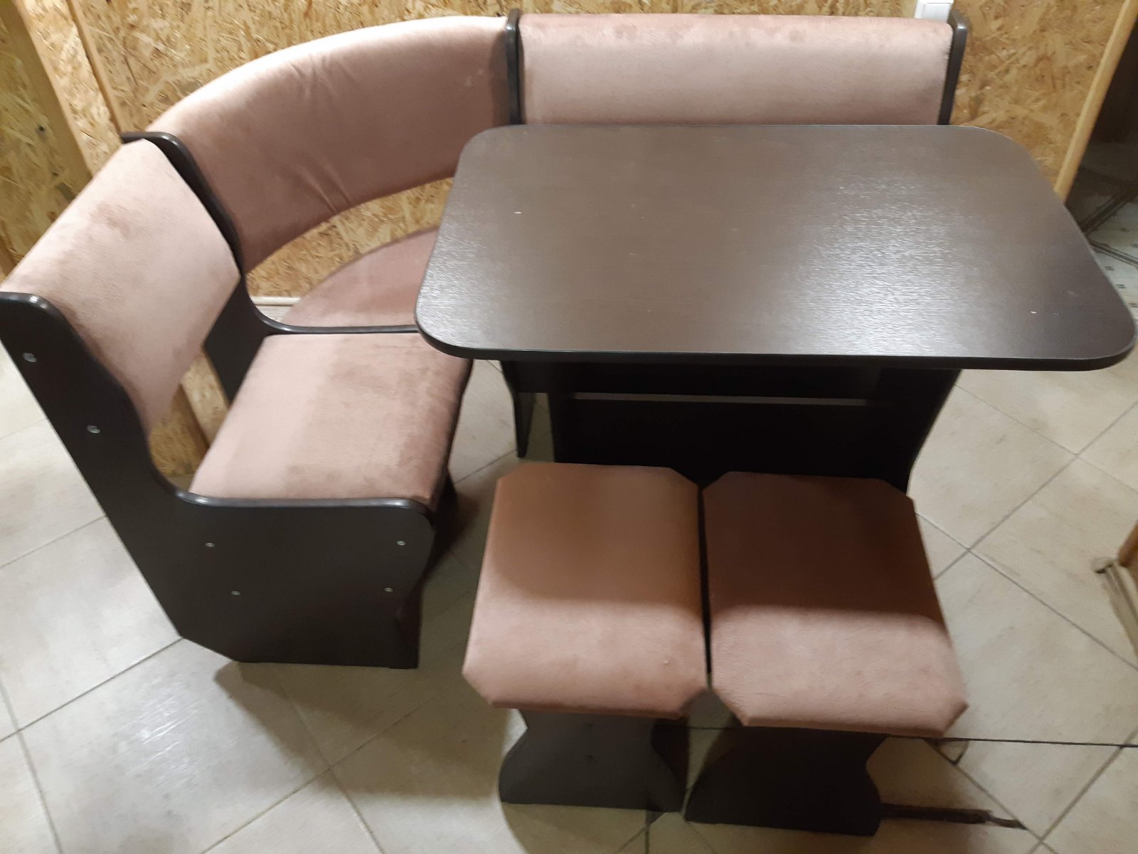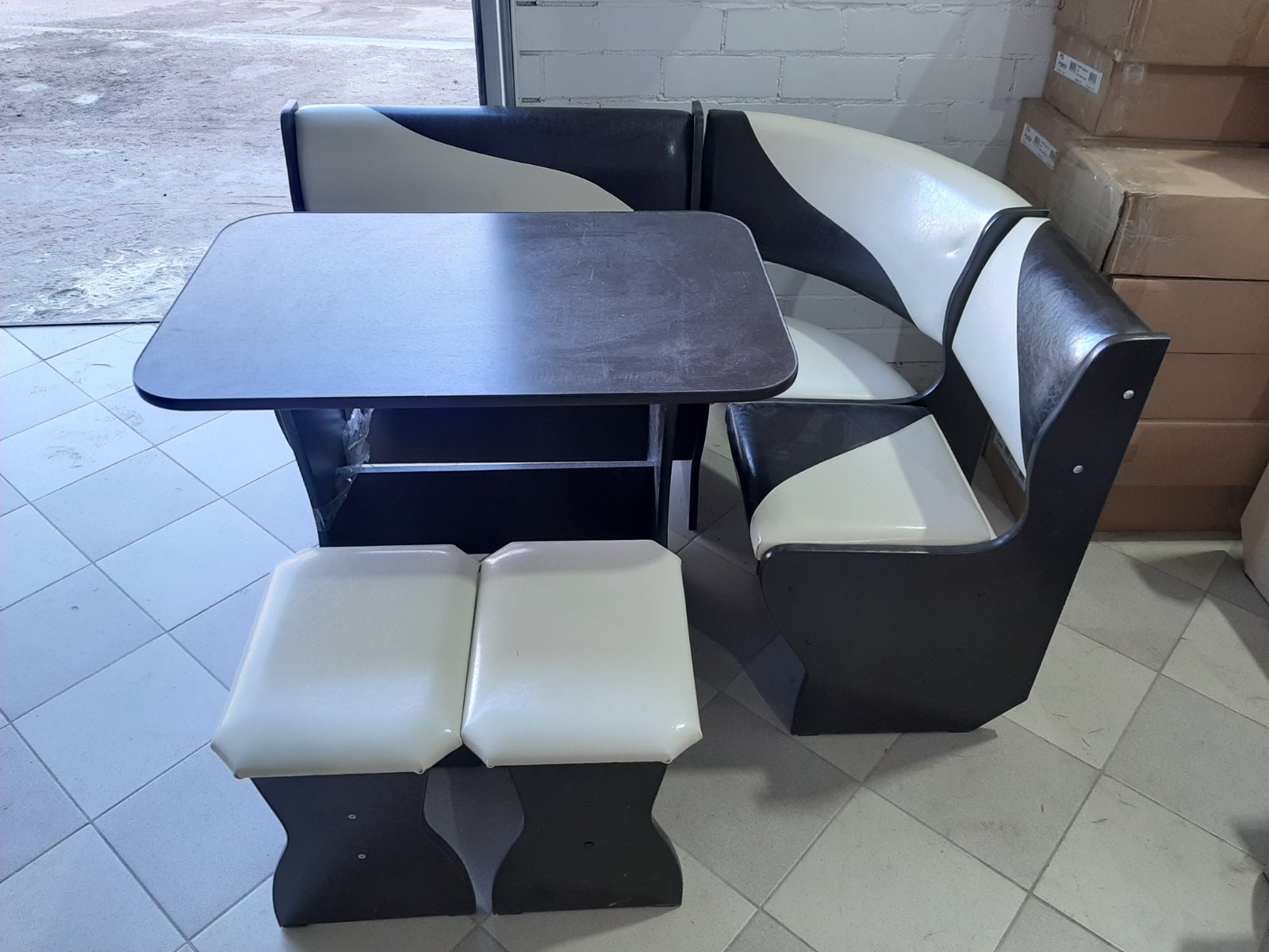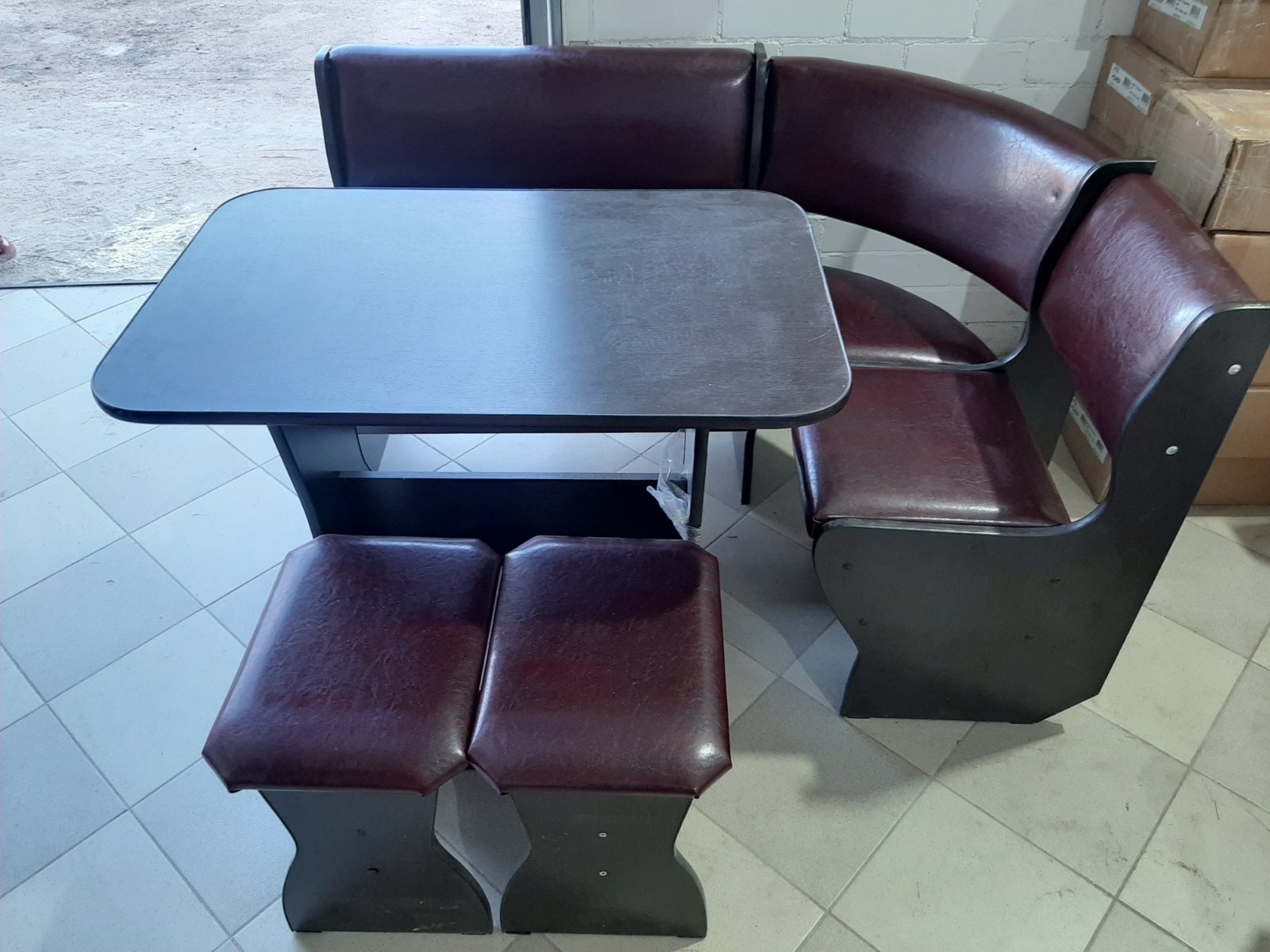 Стильный, функциональный и удобный кухонный уголок, который состоит из: угловой скамьи, стола и двух табуреток.