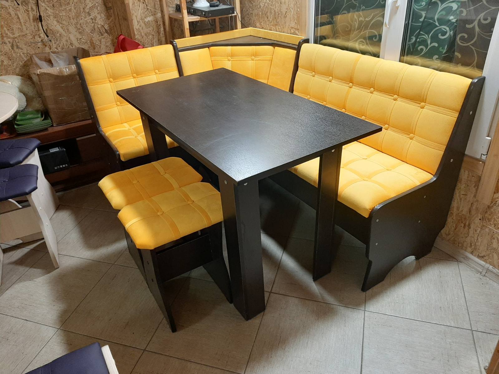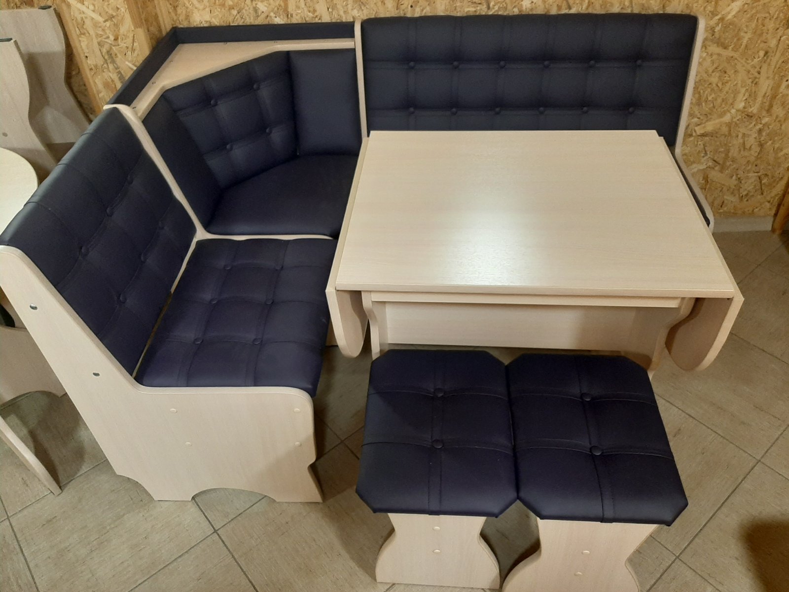 Состоит из углового кухонного дивана, обеденного стола и двух мягких табуретов. Под сиденьем находятся ящики для хранения. Универсальная сборка - право/лево.