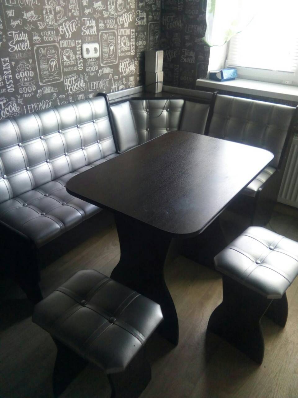 Кухонный уголок с глянцевой обивкой. В набор входит: угловая скамья, стол, два табурета. Обивка: экокожа, ткань.