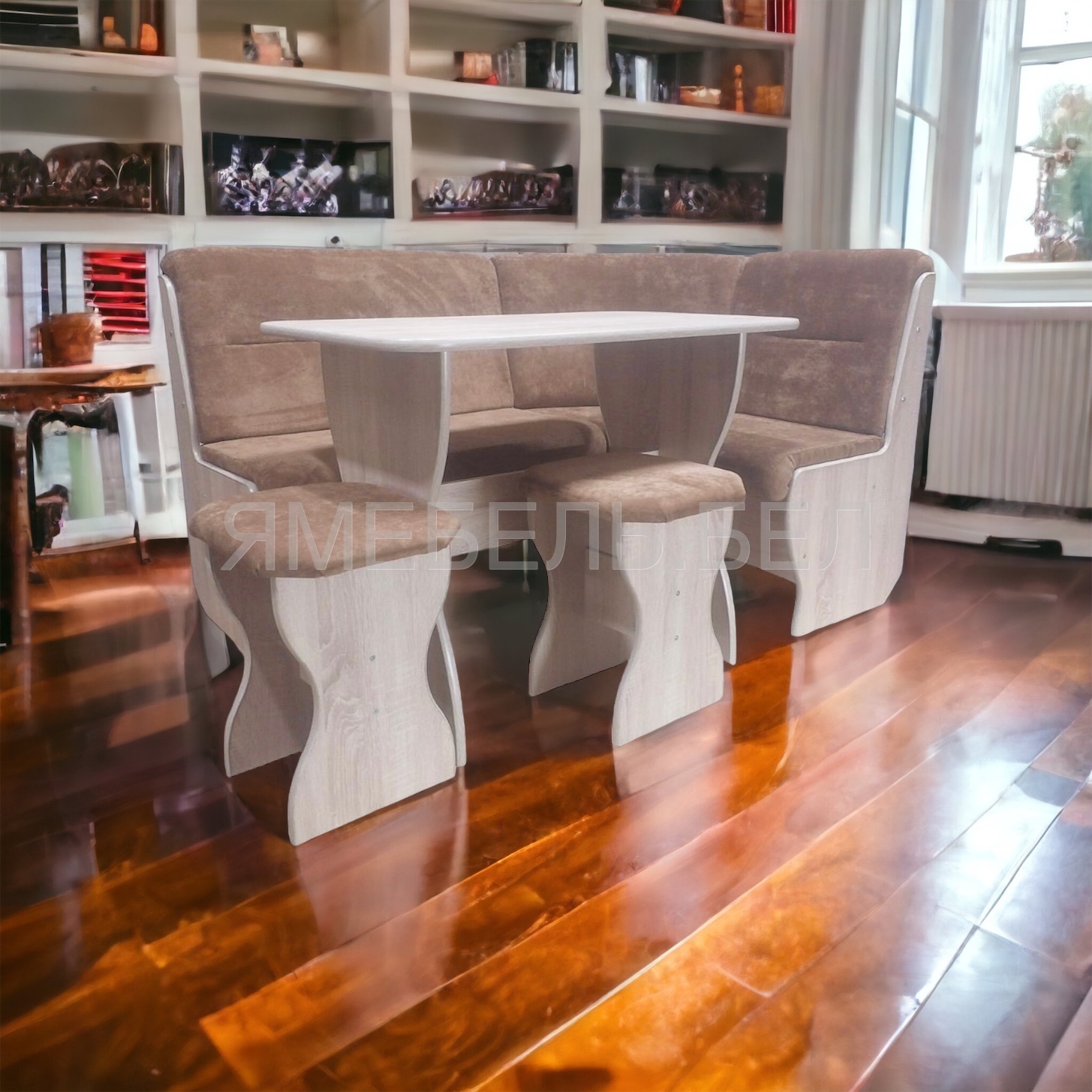 В набор входит угловая скамья, стол и два табурета. Цвет и размер на выбор.