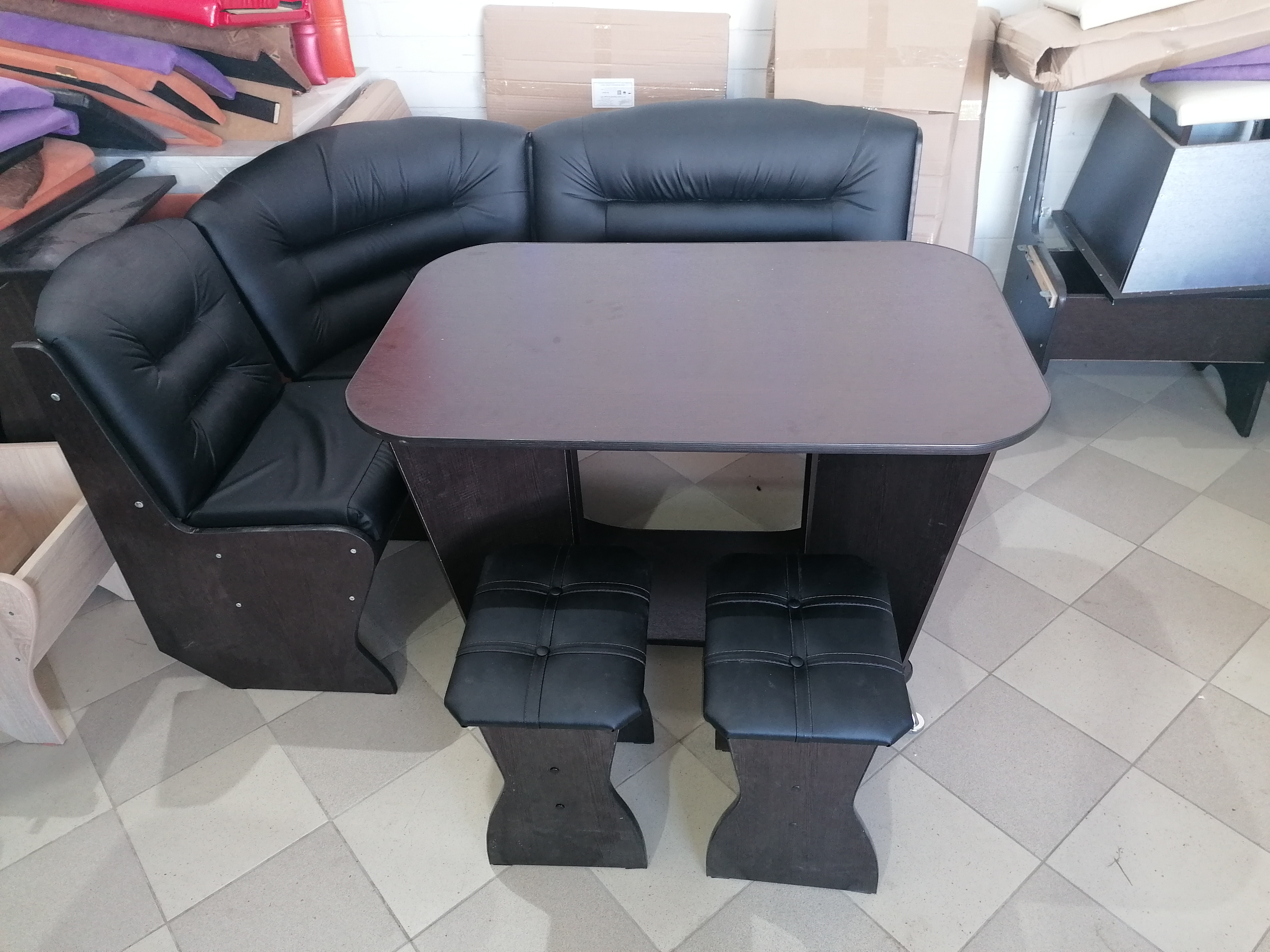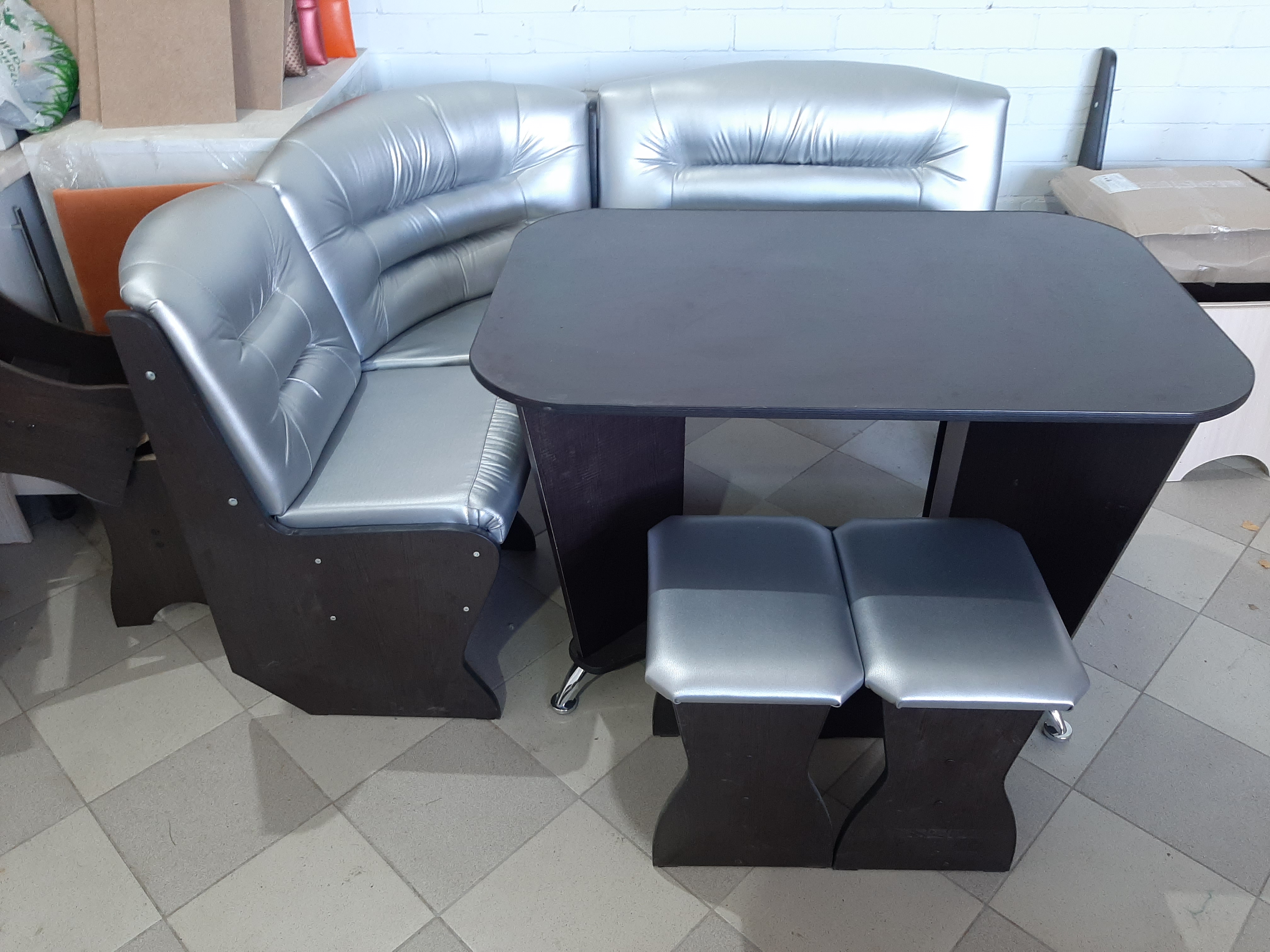 Состоит из углового кухонного дивана, обеденного стола и двух мягких табуретов. Под сиденьем находятся ящики для хранения. Универсальная сборка - право/лево.