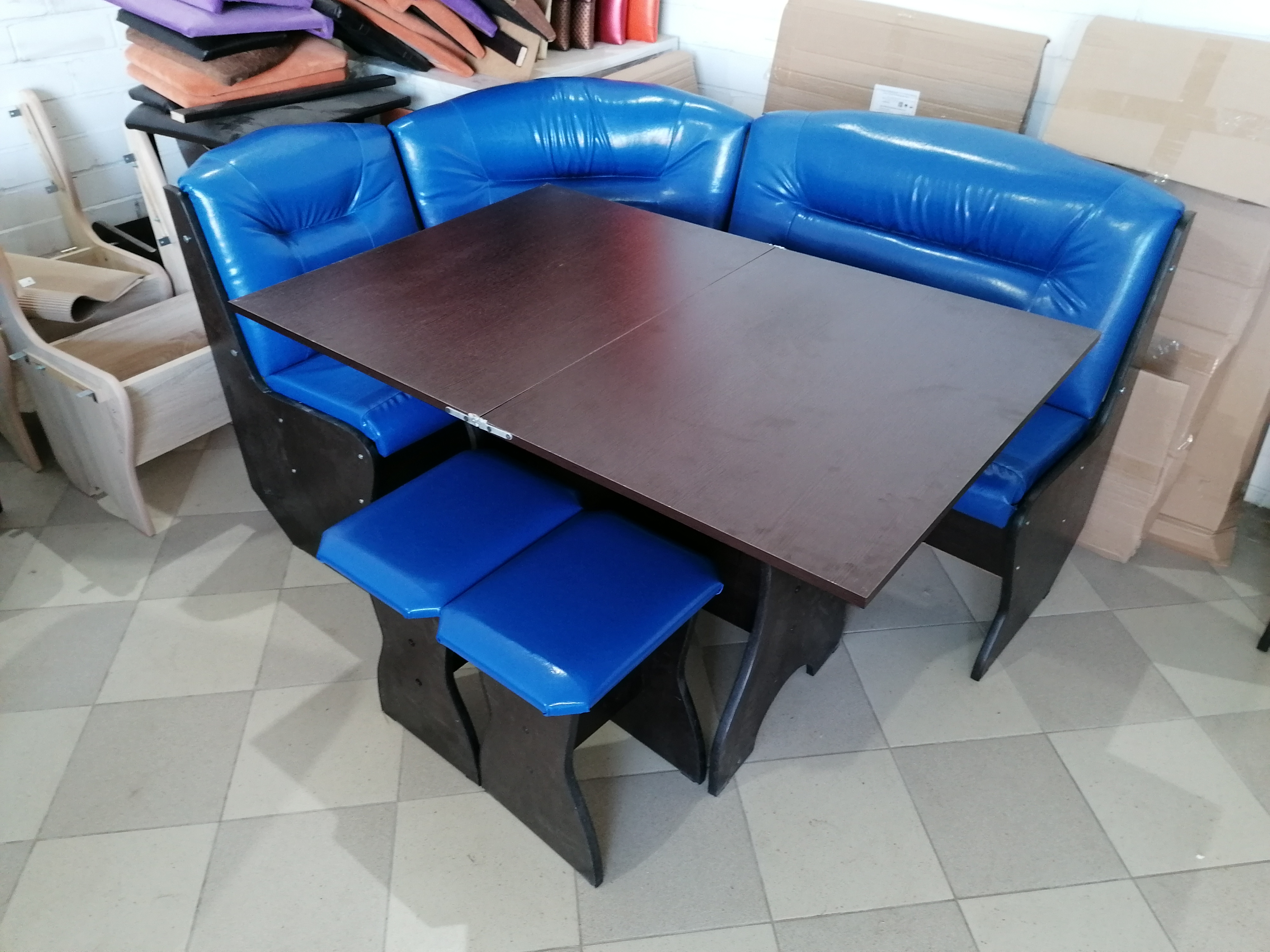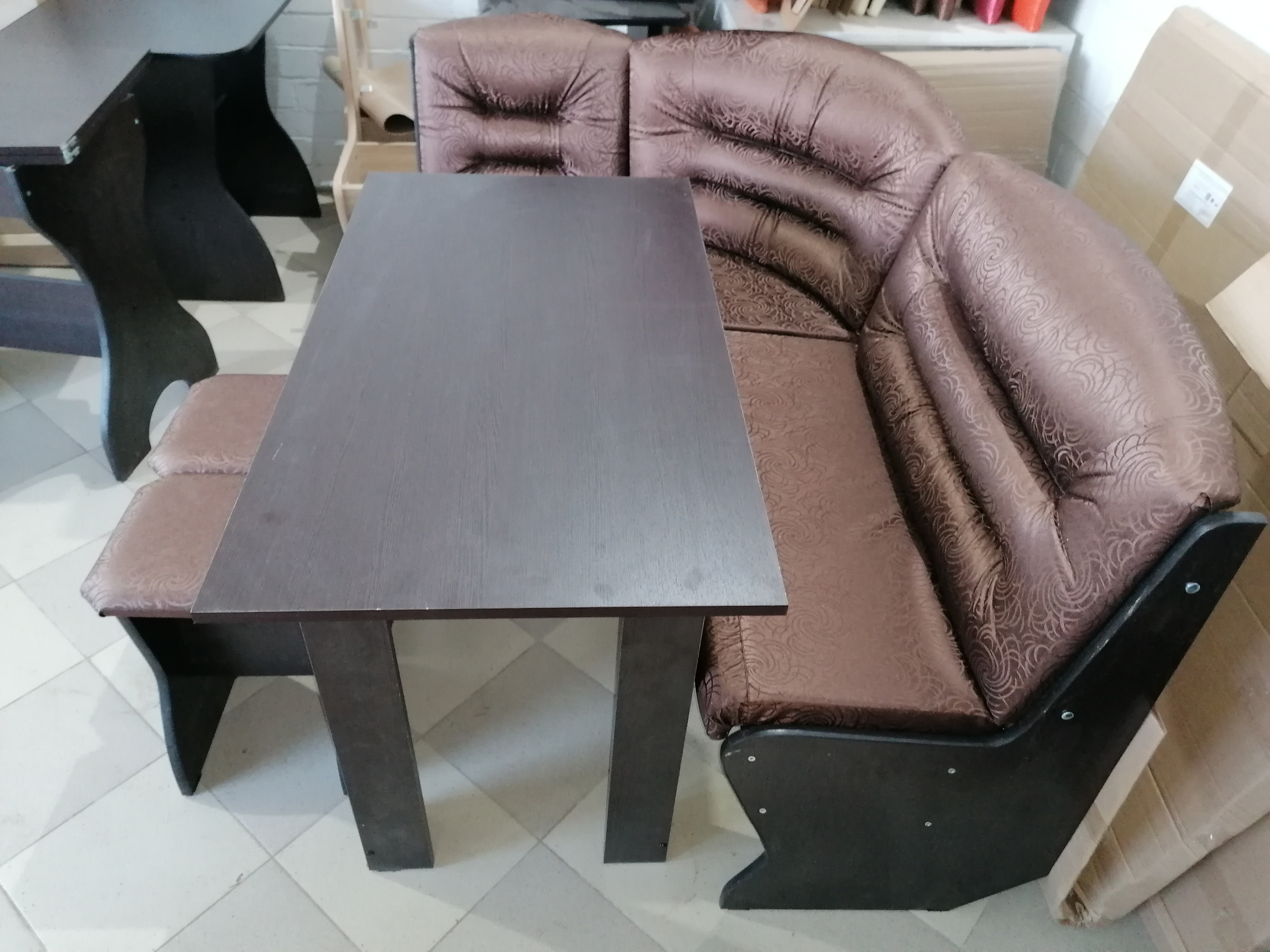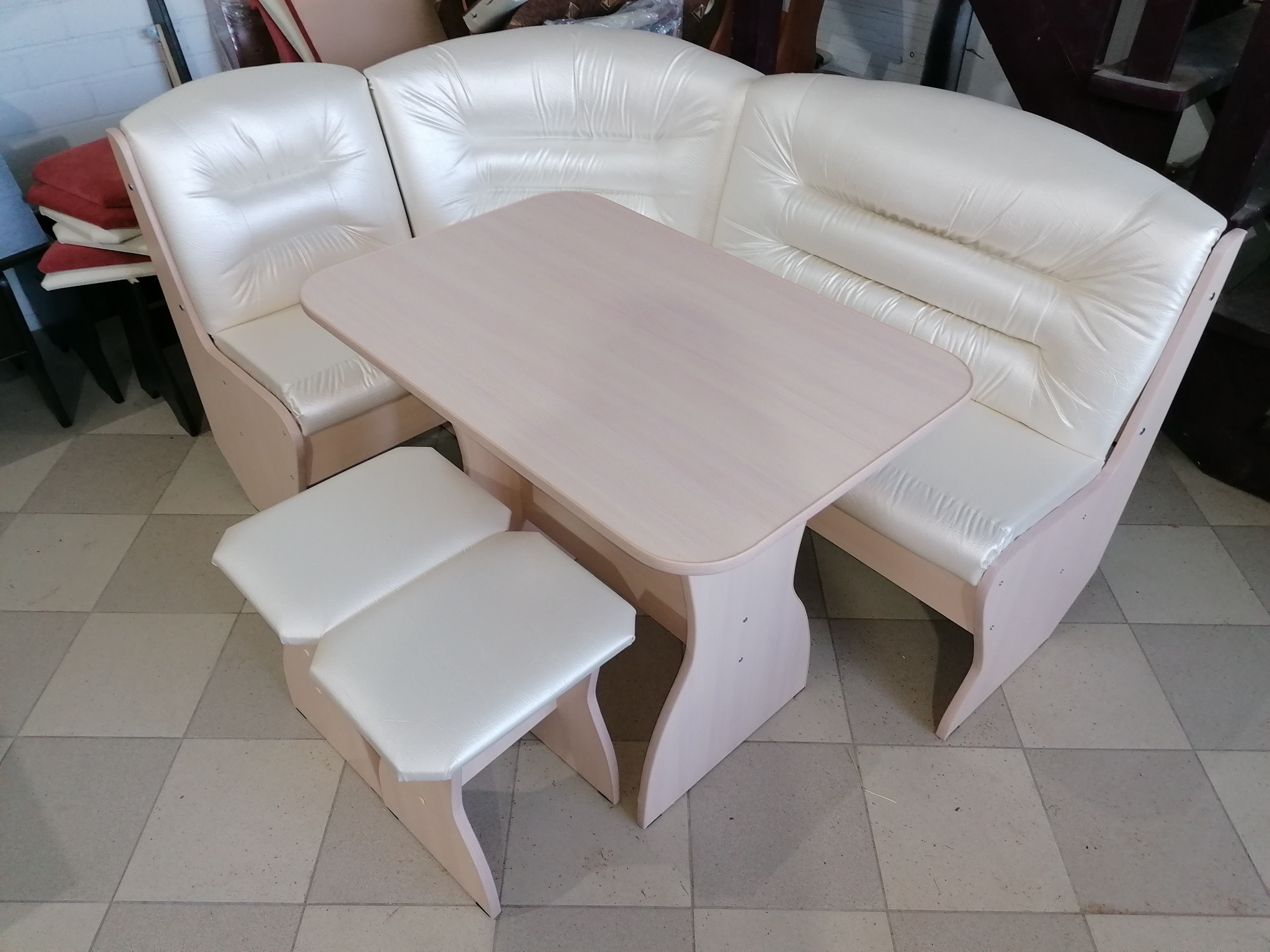В набор входит угловая скамья, стол и два табурета. Цвет и размер на выбор.