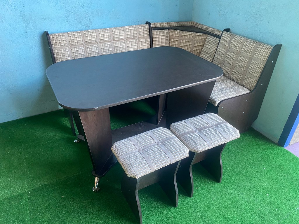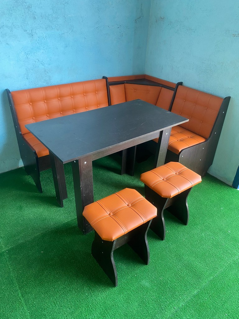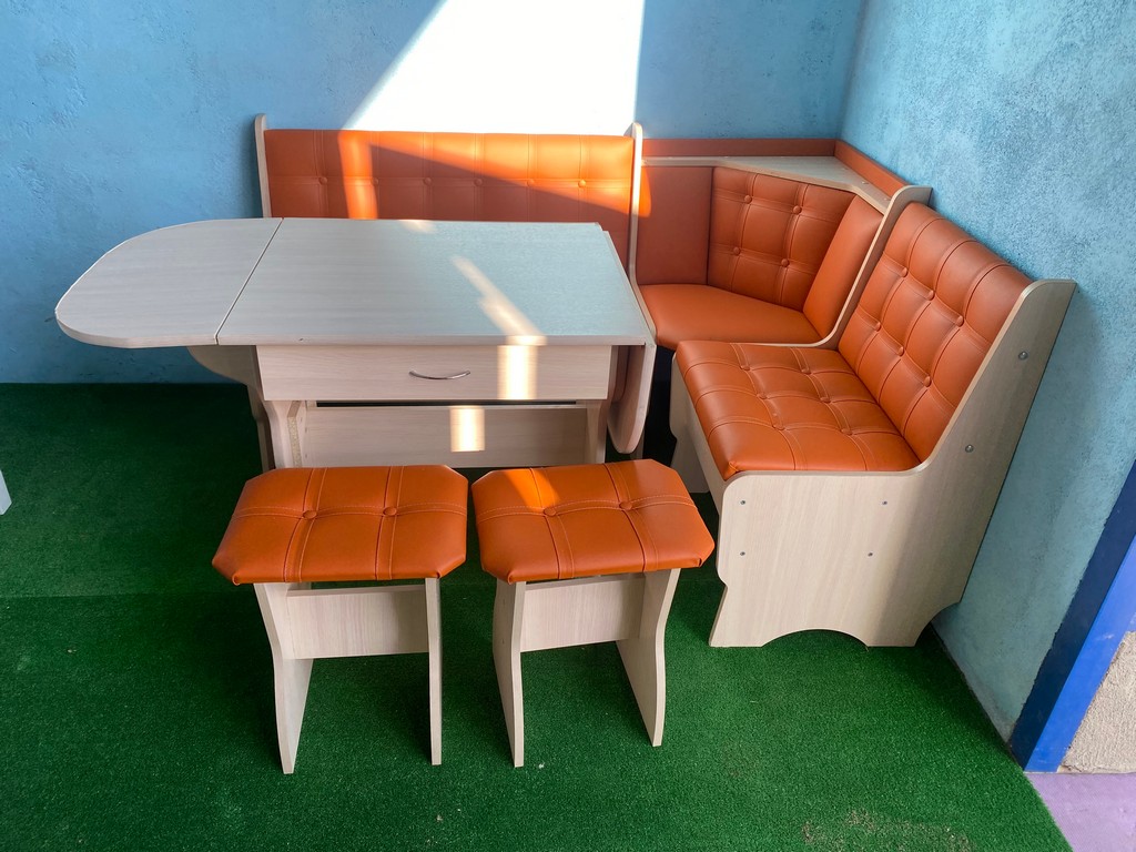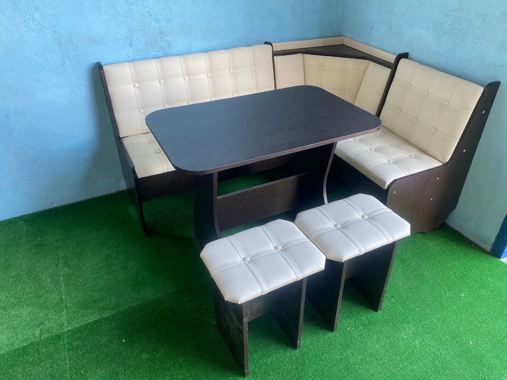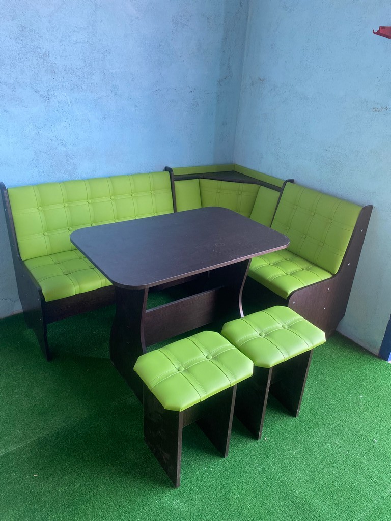 В набор входит угловая скамья, стол и два табурета. Множество вариантов цветов.