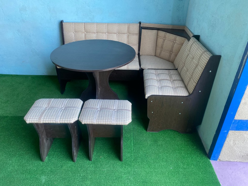 В набор входит угловая скамья, стол и два табурета. Цвет и размер на выбор.