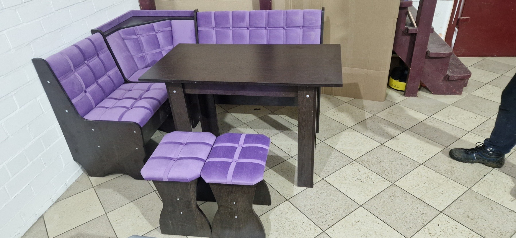 В набор входит угловая скамья, стол и два табурета. Цвет и размер на выбор.