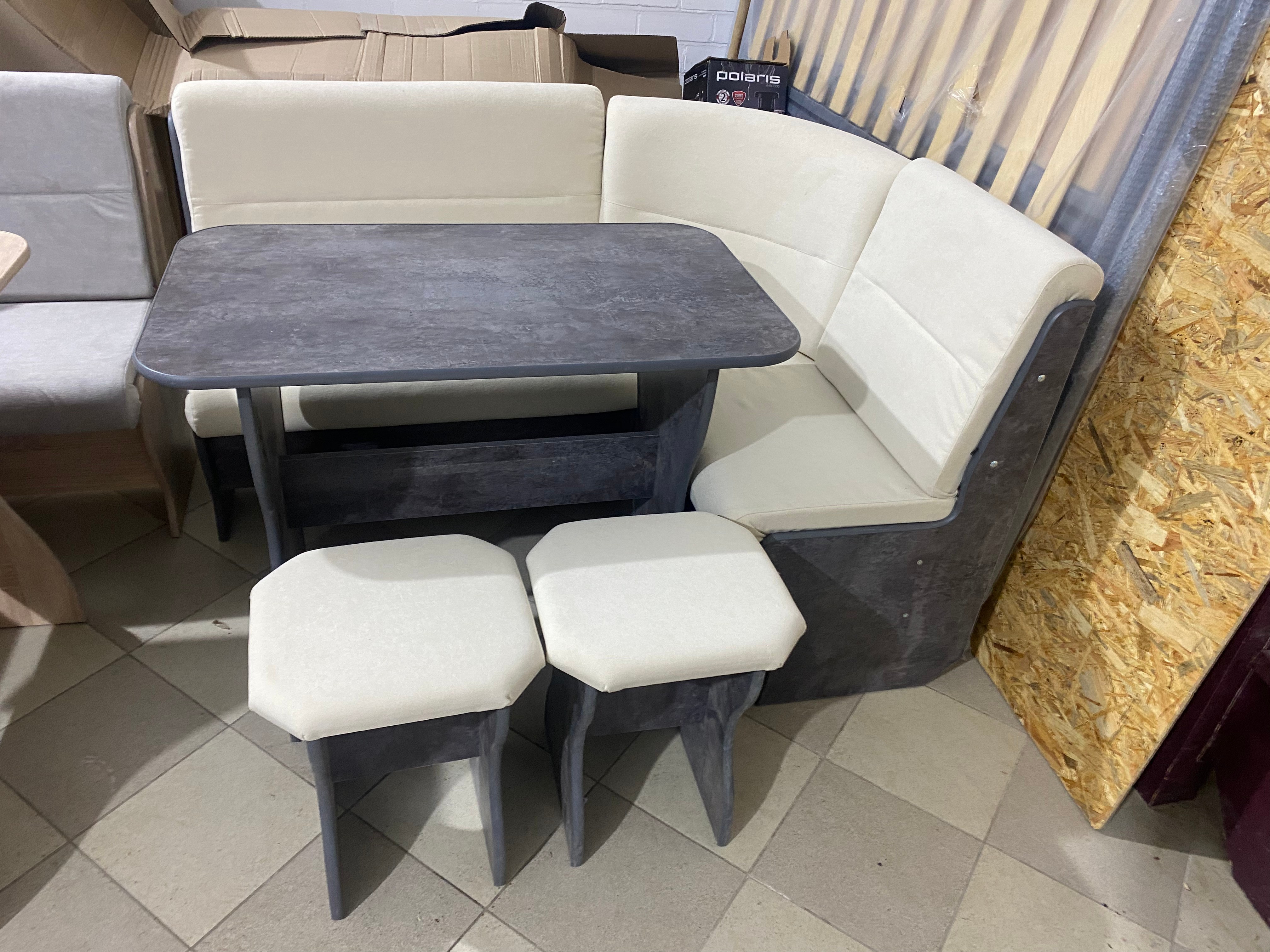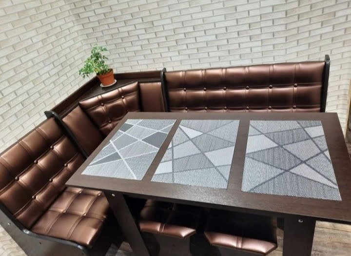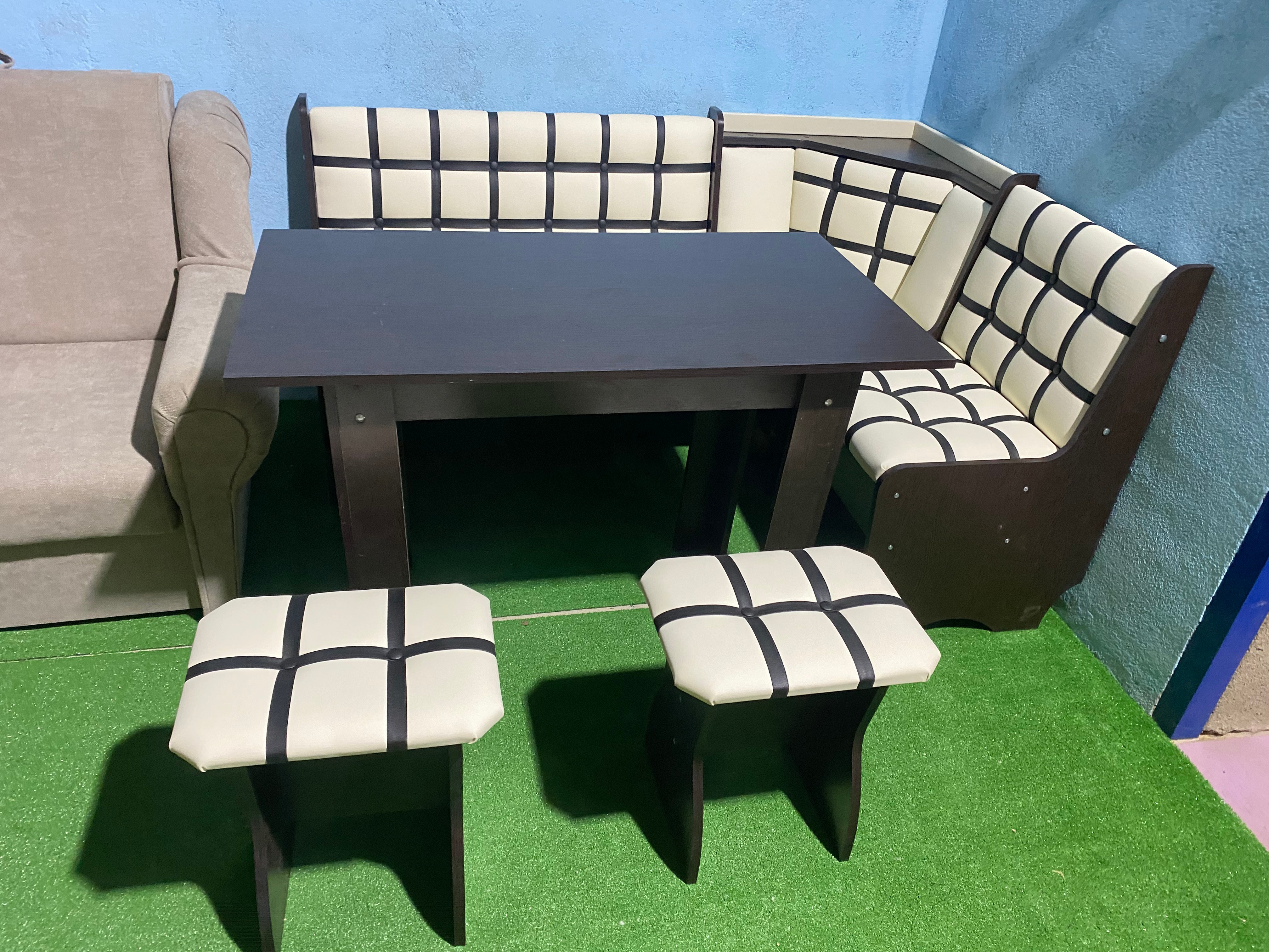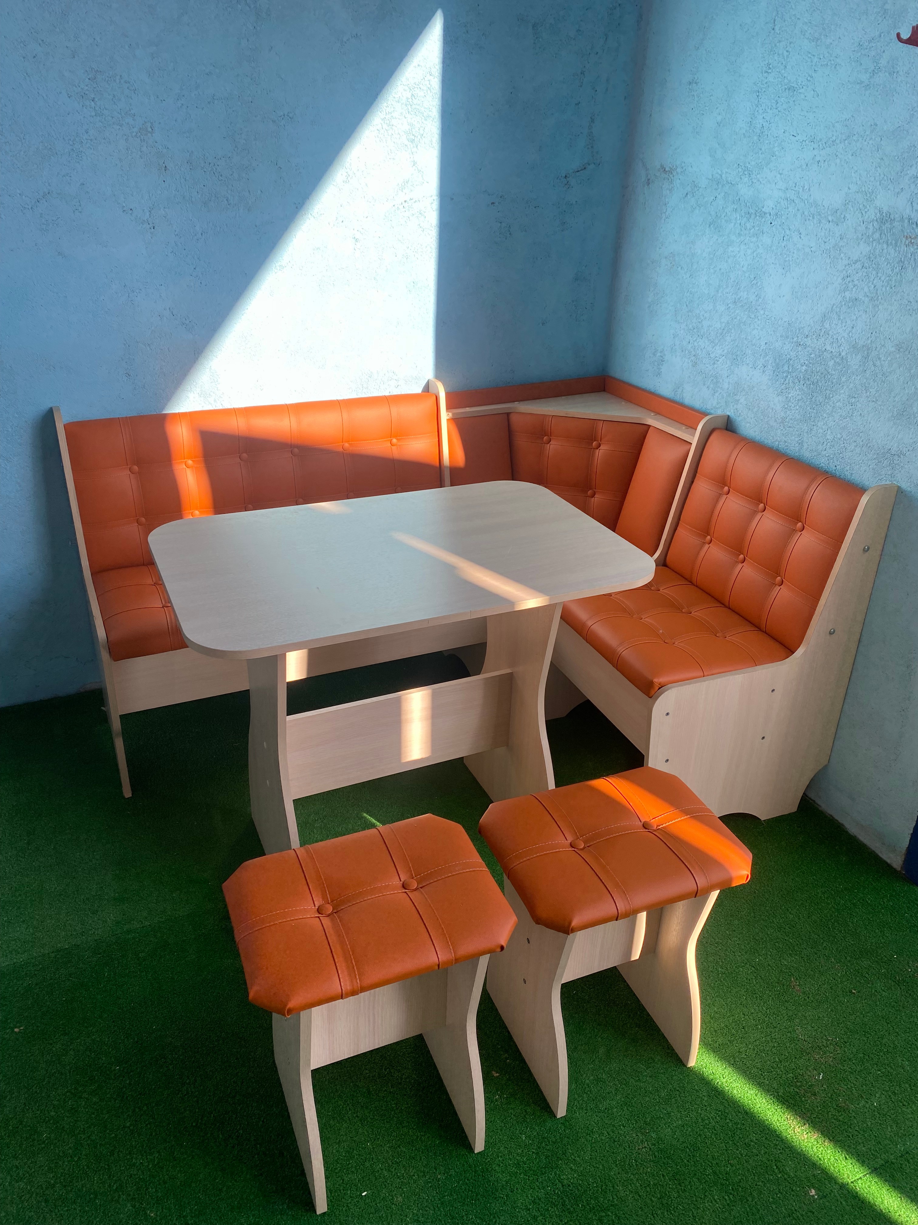 Стильный, функциональный и удобный кухонный уголок, который состоит из: угловой скамьи, стола и двух табуреток.