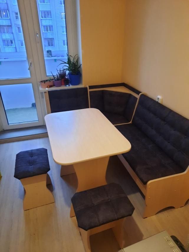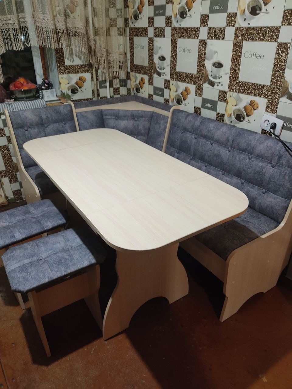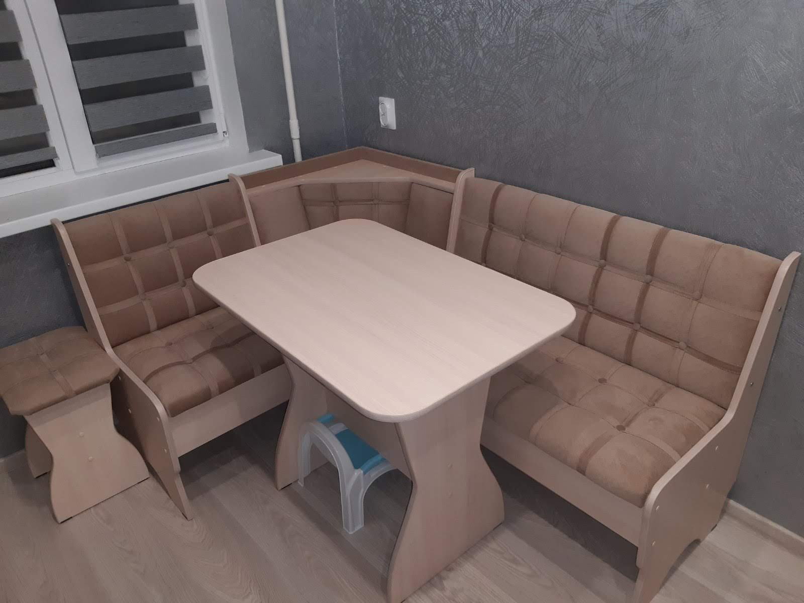 Стильный, функциональный и удобный кухонный уголок, который состоит из: угловой скамьи, стола и двух табуреток.