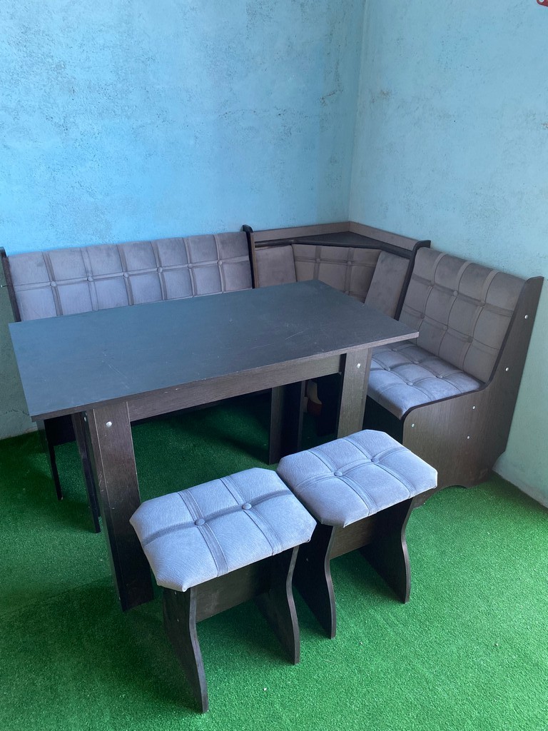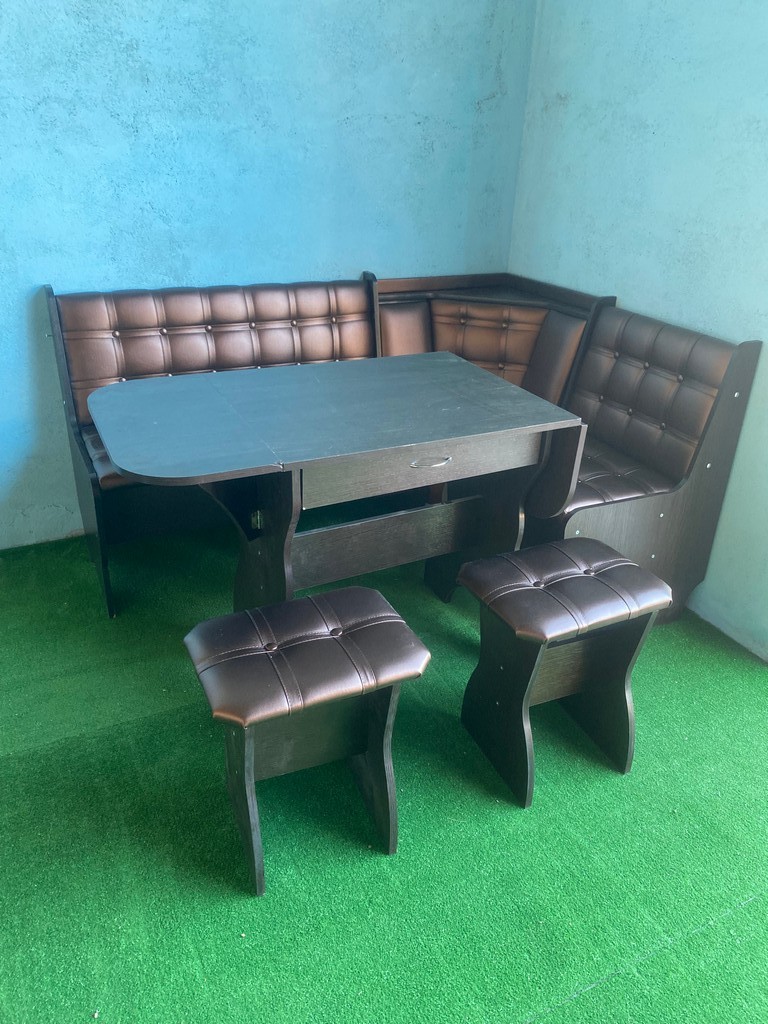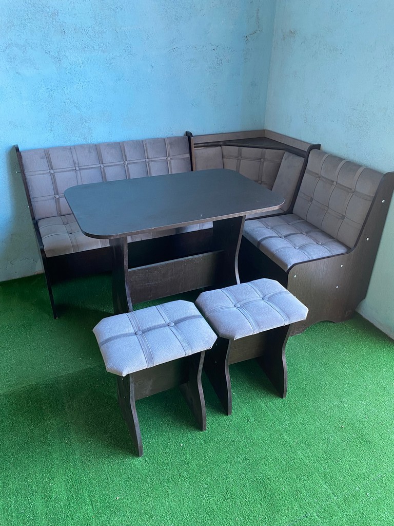 В набор входит угловая скамья, стол и два табурета. Качественная и долговечная обивка.