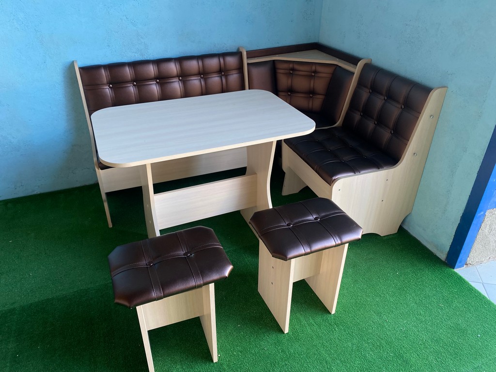 В набор входит угловая скамья, стол и два табурета. Множество вариантов цветов.