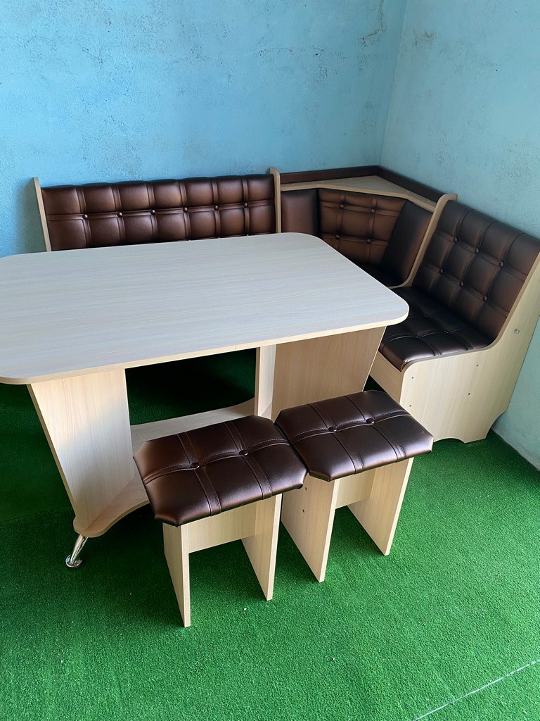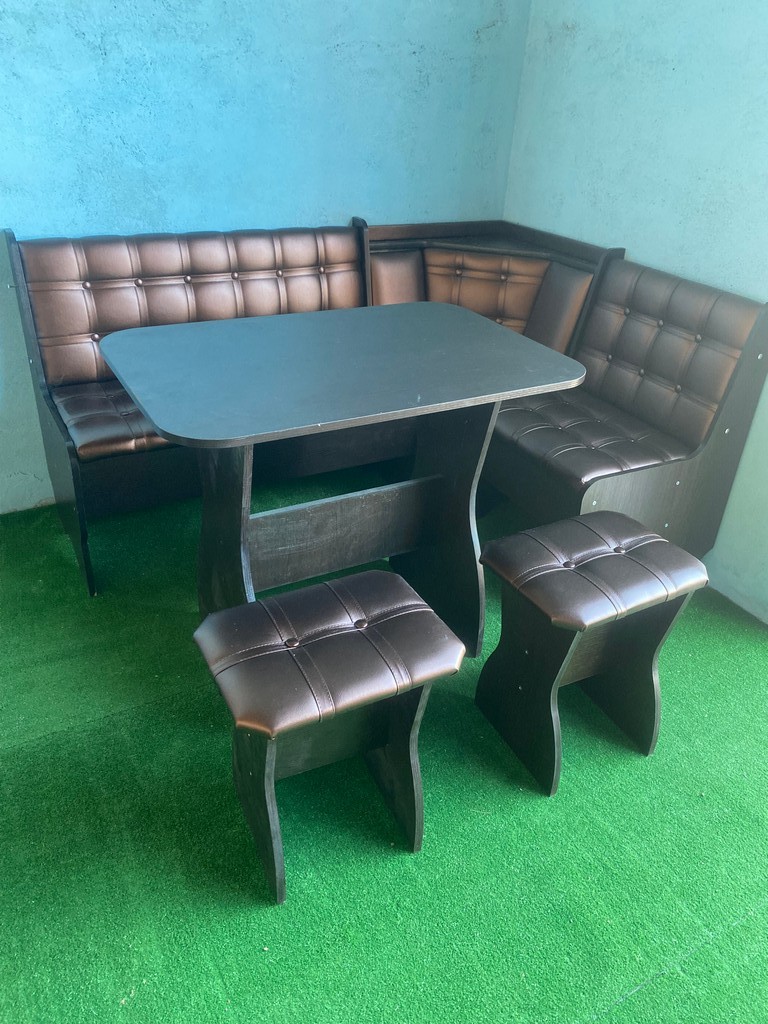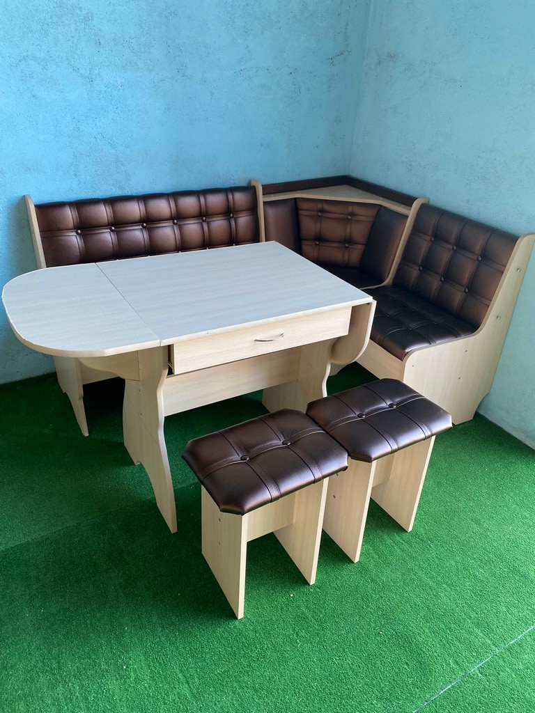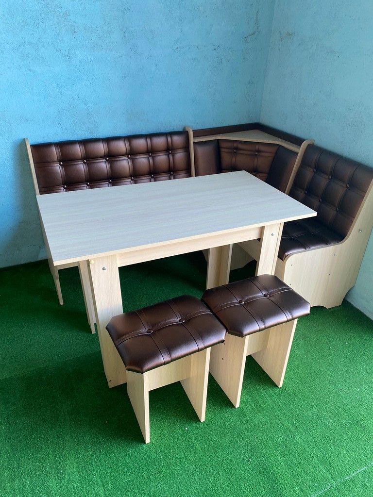 Комплект: угловая кухонная скамья, стол и два табурета. Выбор цвета обивки и ЛДСП.